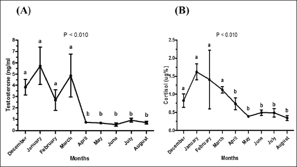 Fig. 2. Testosterone (ng/ml) (A) and cortisol (µg %) (B) concentrations monthly from December to August in male camels. (a,b): Different letters indicate a significant difference (p < 0.01). Ethical approvalThe experimental protocols employed in this study received approval in accordance with the Animal Ethics Committee guidelines at King Faisal University, Saudi Arabia (KFU-412). ResultsHormonal profile in male camelsThe average serum testosterone levels (measured in ng/ml) in male camels exhibited a significant increase (p < 0.01) from December to March. However, there was no statistically significant change observed from April to August, as illustrated in Figure 2A. Simultaneously, cortisol concentrations (measured in µg%) were significantly higher (p < 0.01) during the months from December to March in comparison to the months from April to August, as depicted in Figure 2B. As indicated in Table 1, the most pronounced correlations were found between testosterone and temperature (r=−0.81, p < 0.011), testosterone and cortisol (r=0.80, p < 0.014), and cortisol and temperature (r=−0.83, p < 0.008). Testosterone values exhibited a negative correlation with temperature (r=−0.72, p < 0.003), as depicted in Figure 3A. In addition, testosterone concentrations displayed positive correlations with both cortisol (r=0.70, p < 0.004) and relative humidity (r=0.55, p < 0.002), as shown in Figures 3B and C, respectively. Mean values of testosterone in male camels during the breeding season were higher (p < 0.05) than during the nonbreeding period (Fig. 4A). During the breeding season, the mean values of testosterone in dominant males were higher (p < 0.05) than those in submissive ones (submissive males are socially stressed males in the presence of dominant male); however, testosterone values did not differ (p > 0.05) between dominant and submissive males during the nonbreeding period (Fig. 4B). Effect of external stimuli on male camelsAt the end of rutting and after applying the inductive external stimuli (sounds of other couples heard during mating to arouse the male’s desire), the mean testosterone levels in male camels increased (p < 0.01) than before hearing (Fig. 4C). The increase in testosterone levels after hearing these stimuli coincided with the appearance of behavioral activities indicating libido improvements, such as erection, mounting, and extruding soft palate. Table 1. Spearman’s correlation matrix among testosterone (ng/ml), relative humidity, temperature, and cortisol (µg %) in male camels (n=10).