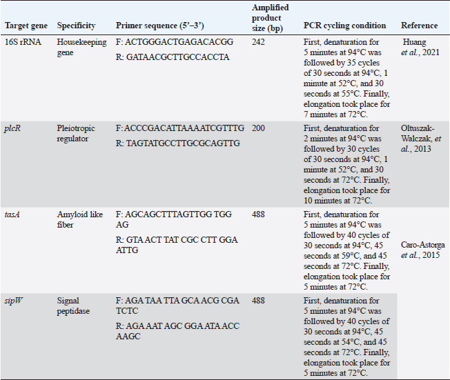 Transcriptional analysis of biofilm genes using RT-qPCRThe relative expression of the pleiotropic regulator (plcR), amyloid such as fiber (tasA) and signal peptidase (sipW) genes were evaluated in MDR strong biofilm-producing B. cereus isolates by RT-qPCR. The relative expressions (fold-change of the expression levels) of the characteristic genes in MDR and adherent isolates after the addition of ACV as antibiofilm agent were matched with those in the control MDR and adherent isolates without the exposure to ACV. The 16S rRNA housekeeping gene was used for RT-qPCR normalization (Fig. 1). The results revealed down-regulation of biofilm genes in comparison to those of the control; this was highly significant (***) for plcR and sipW genes ( p < 0.0001), while was significant (*) with tasA gene (p < 0.05) (Table 8). DiscussionBiofilms can be produced by the B. cereus group of the genus Bacillus in a variety of beverage and food industry settings. Concerned about a significant source of post-process and recurrent cross-contamination in prepared foods that could lead to food poisoning or product degradation, biofilms are a major source of concern for the food trade. Vasudevan et al. (2003) state that biofilms are frequently to blame for recurrent infections. According to Wijman et al. (2007), control over biofilm formation is therefore dependent on providing mechanistic insight into the behavior of B. cereus in biofilms. Therefore, the main objectives of this study were to isolate, identify, and test for antibacterial susceptibility B. cereus that was isolated from samples of meat and meat products. The recovered B. cereus isolates were then used to detect biofilm formation both qualitatively and quantitatively. Furthermore, evaluation of ACV for a better understanding of its effect on the gene expression that is responsible for biofilm formation and its regulator, using RT-qPCR to reduce the drawbacks of antibiotic resistance. The traditional identification methods were exposed as “presumptive B. cereus” because these methods could not distinguish B. cereus from other Bacillus group isolates (Vidic et al., 2020). Therefore, many laboratories’ stages should be performed to distinguish B. cereus from other Bacillus group species (Ramarao et al., 2020). The selective media and biochemical tests that these methods were designed to use are labor-intensive, time-consuming, and require specialized personnel (Zhu et al., 2016). However, molecular methods are more accurate for definitive identification. Herein, B. cereus was isolated from 34 out of 150 meat and meat product samples with an overall prevalence of 22.66%. Our results were consistent with those stated by Guven et al. (2006) (22.4%) and Amin and Tawfick (2021) (24%). On the other hand, higher percentages of B. cereus recovered from meat product samples were detected by Rather et al. (2011) (40%), Abd El Tawab et al. (2015) (38.33%), Yu et al. (2020) (35%), Tewari et al. (2015) (30.9%), Bashir et al. (2017) (29.33%), and Schlegelova et al. (2003) (28%). However, a lower prevalence rate was recorded by Konuma (1988) and Gharib et al. (2020) with percentages of 18.3% and 17.5%, respectively. Bacillus cereus may be present in raw meat products because of unsanitary conditions during meat delivery, processing, or transportation. According to Floristean et al. (2007), improper storage temperatures of raw meat could potentially encourage the growth of bacteria. The processing of minced meat may be the reason for the high frequency of B. cereus isolation from edible meat products such as luncheons or the addition of expired additives, which can induce vegetation of Bacillus spores under insufficient heat treatment (Shawish and Tarabees, 2017). Table 7. Antibiofilm activity of ACV against B. cereus isolates.