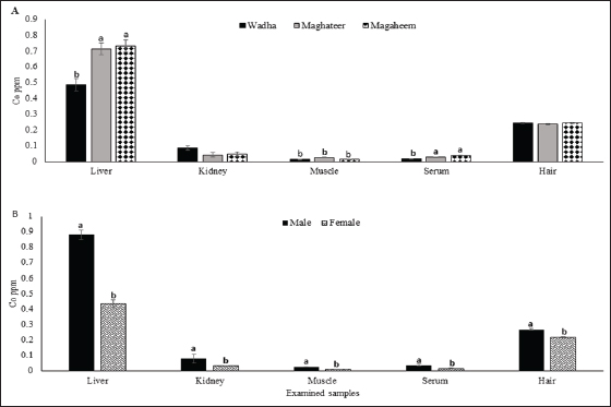 Fig. 2. Chromium mean values (ppm) in liver, kidney, muscle, serum, and hair A. Effect of breed on chromium concentrations (ppm). B. Effect of Gender on chromium concentration (ppm). a,b Means with different superscript letters in the same sample type are significantly different (p ≤ 0.05). Health risk assessmentThe presented results in Table 7 indicated that the EDI of all investigated metals from all breeds were below the tolerated daily intake (TDI) approved by FAO/WHO (2010). The noncarcinogenic hazard ratios (HRs) and hazard indices (HIs) were assessed in Table 8. DiscussionCobaltThe maximum Co concentration found in liver samples from different camel breeds was equivalent to the finding of Mahmud et al. (2011) and Asli et al. (2020) who examined muscle and liver in Iranian camels and found low concentrations in the liver and muscle of camels. Relatively higher levels of Co were reported in the liver compared with meat, liver, lung, heart, and kidney in previous studies as 1.10–14.22 mg kg−1 (Chafik et al., 2014) and 1.913–8.194 mg kg−1 (Al-Perkhdri, 2021). Camel breed influences Co accumulation and distribution in camel organs and muscle. Significant variations (p < 0.05) were found across breeds, which can be explained by each breed’s environment being in a distinct geographical location with varying concentrations of metals in soil, forages, and water. Faye et al. (2008) detected significantly higher cobalt levels in male than female camels collected from Emirates. The positive correlation attributed to Co can enter the body through the digestive tract from food or drink water or lungs after inhalation of Co dust.
