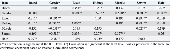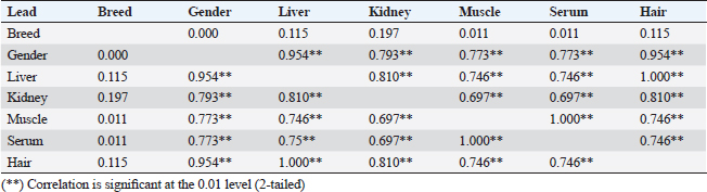 Table 6. Correlations between arsenic concentrations in organs and serum with breed and gender.