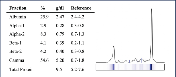 Fig. 1. Proteinogram suggesting monoclonal hypergammaglobulinemia. Tissue samples were routinely processed, paraffin-embedded, and 2 μm thick serial sections were cut and stained with haematoxylin and eosin (H&E) for histopathological evaluation. The several masses presented identical histological features, consisting of multinodular neoplastic lesions with poorly defined borders, composed of dense proliferation of round cells arranged in a diffuse or solid pattern, supported by a scarce extracellular matrix (Fig. 4a). The neoplastic cells had round, ovoid, or sometimes kidney-shaped nuclei, with high pleomorphism, lumpy chromatin, at least two prominent nucleoli and variable amount of acidophilic cytoplasm. It was possible to observe numerous multinucleated cells (Fig. 4b). The neoplastic cells were present in the lymph nodes, infiltrating adjacent muscle and adipose tissue, as well as in the heart (Fig. 4e), diaphragm and peritoneum. Mitotic activity was counted in ten high power fields (HPFs) and the average result reached at least 6 mitoses/HPF. Additionally, a histological examination of the lungs revealed subacute to chronic interstitial pneumonia and the presence of bacterial organisms with a rod-like morphology, pulmonary oedema, and congestion.