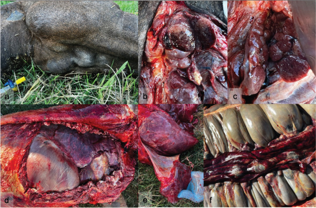 Fig. 3. Macroscopic findings of the mare submitted to necropsy. (a) Lymphadenopathy of the mandibular lymph nodes; (b) and (c) Cross-section of multiple and well-circumscribed multinodular lesions located in the submandibular region; (d) and (e) Lesions and petechiae distributed along the serous surface of diaphragm, pericardium, and heart; (f) Petechiae and oedema in the gastrointestinal tract and mesentery and enlarged mesenteric lymph nodes. DiscussionEquine lymphoma is a heterogeneous disease with a variable presentation of clinical signs, laboratory parameters, and pathological findings (Meyer et al., 2006). Lymphoma affects horses of all breeds and there is no apparent genetic predisposition for the development of this neoplasia. Nevertheless, reports of lymphoma in an aborted equine fetus and in two 1-year-old horses suggest that congenital alterations may be implicated in tumour development (Tomlinson et al., 1979; Haley and Spraker, 1983; Taintor and Schleis, 2011). Horses between 5 and 10 years of age are more predisposed to developing this neoplasia (Meyer et al., 2006; Durham et al., 2013), which is in line with the current case description. Multicentric lymphoma is the most frequent type of haematopoietic neoplasia of the horse, characterized by the generalized involvement of superficial and deep lymph nodes and diffuse involvement of other organs. In this case, in addition to the generalized involvement of the lymph nodes, the lymphoma extended to the muscles and adjacent adipose tissue, diaphragm, heart, and peritoneum, suggesting probable dissemination of neoplastic lymphocytes. The risk factors for the development of equine lymphoma are unknown, as well as the presence of etiological factors (Miglio et al., 2019). The possible involvement of retroviral or corynebacterial infections in malignant transformation has been speculated, but results have been inconclusive (Sheahan et al., 1980; Vander and Davis, 2013). A recent study developed by Miglio et al. (2019) detected positivity for EHV-5 in lymphoma equine tissues. Given the association between EHV-5 and some forms of lymphoma (multicentric, cutaneous, and solitary) and the fact that the horse is a natural host for herpesvirus, viral involvement in equine lymphoma should be investigated (Vander and Davis, 2013). In this animal, PCR for EHV-5 was negative, possibly excluding this etiological agent.