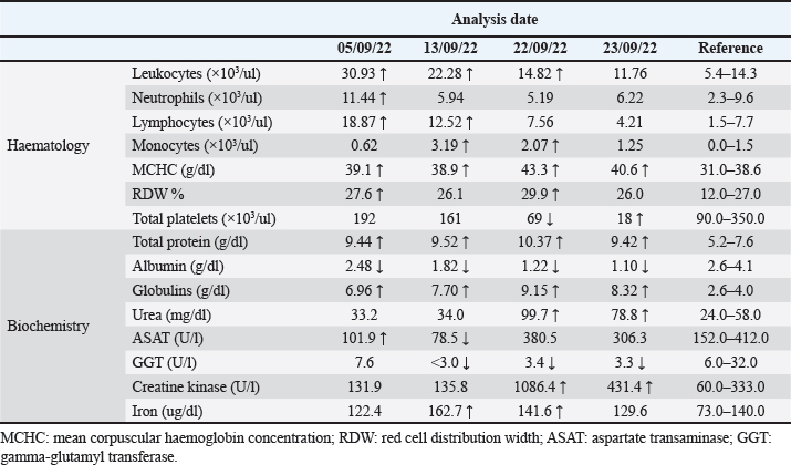 AbstractBackground: Although relatively uncommon, lymphoma is the most prevalent haematopoietic neoplasia in horses, and multicentric lymphoma remains the most common presentation of the disease. The pathogenesis of equine lymphoma is still poorly understood and the diagnosis is usually confirmed at an advanced stage of the disease, compromising the prognosis. This study investigated the clinical, pathological, and molecular features of a case of equine multicentric lymphoma. Case Description: An apparently healthy 5-year-old crossbreed mare hospitalized at the Centre of Animal Reproduction of Vairão, Portugal, suddenly presented clinical signs of supraorbital oedema and mandibular lymph node enlargement, developing fever, facial oedema, and generalized lymphadenopathy. The mare ended up dying twenty-four days after the first clinical signs due to multisystem organ failure. Haematological and biochemical analyses, necropsy, and microscopic and molecular evaluation of affected tissues were performed. At necropsy, the main findings were multiple multinodular lesions, distributed along the serous surface of oropharynx, trachea, pericardium, gastrointestinal tract, and mesentery. Microscopically, these consisted of solid proliferations of neoplastic round cells that exhibited immunopositivity for CD3 (T cells). Based on these findings, a medium-grade multicentric T-cell lymphoma was diagnosed. Conclusion: There is still very little research regarding the molecular characterization of lymphoma in horses. As an entity itself is quite heterogeneous, it is important to describe the interspecies particularities to understand its development and behaviour. Keywords: Equine, Horse, Lymphoma, Multicentric, T-cell. IntroductionLymphoma is a haematopoietic neoplasia that represents a heterogeneous group of malignancies originating in lymphoid tissue (lymph nodes, spleen, and gut-associated lymphoid tissue) (Taintor and Schleis, 2011). Although haemolymphatic tumours in horses are relatively uncommon, lymphoma is the most prevalent haematopoietic neoplasia in this species (Meyer et al., 2006). Based on anatomical location, lymphoma can be classified as multicentric, alimentary, mediastinal, cutaneous, and solitary (extranodal) (Miglio et al., 2019). In horses, multicentric lymphoma is the most frequent, followed by alimentary lymphoma, which remains the most common intestinal neoplasm in this species (Miglio et al., 2019). Although less common, lymphomas of the upper airways, central nervous system, heart, adrenal glands, reproductive organs, and eyes have also been reported (Taintor and Schleis, 2011). Lymphoma immunophenotyping allows the characterization of neoplastic cell histogenesis as B cells, T cells, and Natural Killer cells, and according to a retrospective study, T-cell-rich large B-cell lymphoma (TCRLBC) is the most common lymphoma subtype in horses (Durham et al., 2013). The pathogenesis of equine lymphoma is still poorly understood. There is no apparent breed or sex predilection. Any age can be affected, however, a greater predisposition for horses with 5–10 years of age is reported (Meyer et al., 2006; Durham et al., 2013). In horses, clinical signs common to all forms of lymphoma include weight loss, depression, lethargy, swelling of the ventral body wall or distal limbs, recurrent fever, and lymphadenopathy (Taintor and Schleis, 2011). Clinical signs of lymphoma are generally the result of the dysfunction of the affected organs, and the course of the disease is typically rapid, whereby the clinical manifestation tends to be evident at a late stage (Germann et al., 2008). The associated laboratory findings in horses with lymphoma reflect a high frequency of abnormalities, namely anaemia, thrombocytopenia, hyperfibrinogenaemia, hypoalbuminaemia, and hyperglobulinaemia (Meyer et al., 2006). In horses with suspected lymphoma, the diagnosis involves physical examination, focusing on the evaluation of superficial and deep lymph nodes evaluation and thoracic and abdominal ultrasound, to observe images suggestive of neoplastic transformation. Definitive diagnosis is made through the identification of neoplastic lymphocytes in tissues, fluids, or peripheral blood. Histopathological examination remains the most accurate method for diagnosing this disease (Ness, 2016). The prognosis of all forms of lymphoma is poor. Nevertheless, to prolong the survival time, surgical excision, radiation, and chemotherapy are available as palliative therapies in horses (Ness, 2016). In this report, we describe the clinical, laboratory, and histopathological findings of a 5-year-old mare diagnosed with multicentric lymphoma. Case DetailsOn 30th of August 2022, a 5-year-old crossbreed mare was hospitalized at the Centre of Animal Reproduction of Vairão, Portugal, for routine reproductive procedures. On physical examination, supraorbital oedema and enlargement of the mandibular lymph nodes were detected. Therefore, due to suspicion of an anaphylactic reaction, a single dose of intravenous (IV) Diurizone® (dexamethasone and dihydrochlorothiazide) was administered, and on the next day, IV flunixin-meglumine (1.1 mg/Kg; SID) was provided following an episode of slight hyperthermia. Six days later, the facial swelling increased involving the masseteric region that displayed a positive godet sign, but without any signs of pain or discomfort on palpation. No signs of dysphagia, purulent nasal discharge, or enlarged guttural pouches were observed. Ultrasound examination of the head confirmed oedema and lymphadenopathy. Radiographic projections of the head and endoscopy of the upper airways were also performed, which did not reveal any other alterations. Consecutive haematological and biochemical analyses were performed, whose alterations are summarized in Table 1. Due to the suspicion of an infectious condition, a continuous therapeutic protocol was started with intramuscular (IM) procaine penicillin (22,000 IU/Kg; BI