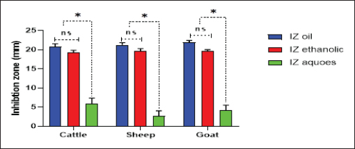 Fig. 4. Antibacterial efficacy of M. oleifera oil and extracts according to their inhibition zones (IZ) against CP isolates in cattle sheep and goats. In vitro evaluation of the antimicrobial activities of Moringa plantThe antibacterial efficacy of M. oleifera oil and extracts against CP isolates from different animals was studied. According to agar well diffusion results, the oil and ethanolic extracts of M. oleifera leaves were of high antibacterial potency as shown in Figure 4. The oil and the ethanolic treatment of M. oleifera produced significantly higher zones of inhibition that ranged from 20 to 24 mm than the aqueous extracts (which did not exceed 10 mm) against CP in cattle, sheep, and goat (p < 0.05). Nonsignificant differences were observed between the M. oleifera oil and the ethanolic extract in all studied strains. Correlation of M. oleifera oil and extracts and toxin types of CP isolatesBased on the animal species and toxin type of CP, Figure 5 showed that the antibacterial efficacy of M. oleifera oil had been strongly correlated with all types of the recovered isolates particularly type A in (cattle, sheep, and goat) species. However, ethanol and aqueous extracts of the plant leaves correlated in lesser values. Correlation between sensitivity results of M. oleifera oil and extracts and most tested antibiotics against CP isolatesThe relation between the sensitivity results by aqueous, ethanolic extract and oil of M. oleifera against CP isolates in three tested animal species (cattle, sheep, and goat) was demonstrated in Figure 6A–C, respectively. The analysis of the area under this curve in Figure 6A discussed similar efficacy of the aqueous extract of M. oleifera with both chloramphenicol and amoxicillin clavulanic acid drugs which were closely correlated with it. However, the sensitivity of the cefotaxime drug was closely correlated with that produced by the ethanolic extract of M. oleifera plant against CP isolates as shown in Figure 6B. Moreover, ciprofloxacin and gentamycin drugs emerged highest sensitivity that was equal to that given by the oil of M. oleifera (Fig. 6C).