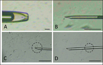 Fig. 1. Holding pipette (A) and injection needle (B) setting. Sperm (in dashed circle) are immobilized by touching the tail (C) followed by aspiration (D).