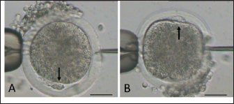 Fig. 2. Mature oocyte handled during sperm injection according to its polar body (PB) position, as shown by arrow (A: PB at 6 and B: PB at at 12 o’clock). (bar=50 μm). Table 1. Epididymal sperm quality parameter during preservation.