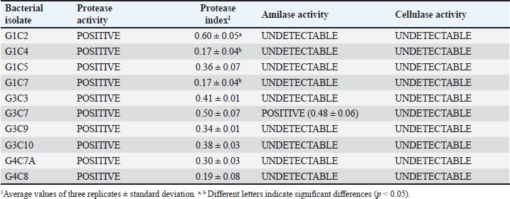 Table 2. Assessment of protease, amylase, and cellulase enzymatic activity in selected bacterial isolates.