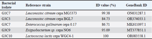 where AbsSalm and Absacid correspond to the absorbance at 650 nm of the Salmonella sp. and the lactic acid bacteria suspension at the beginning of the assay. Absmixture corresponds to the absorbance at 650 nm of the mixture of Salmonella sp. with lactic acid bacteria after 3 hours of the assay (Tuo et al., 2013). Bacterial molecular identification using 16S rRNA markerThe selected bacterial isolates from the previous tests were identified using molecular assays targeting a fragment of the 16S rRNA gene. Bacterial cultures were grown in MRS broth for 20 hours at 37°C under microaerophilic conditions, and their concentration was adjusted to 1.0 OD650. Bacteria were then centrifuged at 5,000 g for 10 minutes, and the resulting pellet was resuspended in saline solution (NaCl 0.9%). Genomic DNA (gDNA) was extracted using the GeneJet Genomic DNA Purification Kit (Thermo Scientific, USA), following the manufacturer’s recommended procedures (Ahmed et al., 2021). The quantity and purity of the obtained gDNA were verified using the spectrophotometer NanoDrop OneC (Thermo Scientific, USA). The bacterial genomic DNA’s 16S rRNA gene fragment was amplified using universal primers 27F: 5′ AGAGTTTGATCCTGGCTCAG 3′ and 1492R: 5′ GGTTACCTTGTTACGACTT 3′ at a concentration of 0.24 uM. The amplification was carried out through Polymerase Chain Reaction (PCR), employing 1U of Maximo Taq DNA polymerase (Geneon, Germany) and 0.2 mM dNTPs (Geneaid) in a 50 ul reaction volume. PCR was performed using a SimpliAmp thermocycler (Applied Biosystem, USA), initiating with an initial denaturation step at 95°C for 5 minutes. This was followed by 35 cycles of denaturation at 95°C for 30 seconds, annealing at 54°C for 40 seconds, and extension at 72°C for 1 minutes. An additional extension step at 72°C for 7 minutes concluded the cycling, followed by a final step at 4°C. The presence of PCR products was confirmed by electrophoresis on 1.5% agarose gels (Geneon, Germany) alongside a 100 bp DNA ladder (Geneaid Biotech, Taiwan). The PCR products were analyzed by 1.5 % agarose gel electrophoresis using a 1× buffer Tris-acetate-EDTA also used for the immersion of gel. Electrophoresis was run at 90V for 40 minutes in a Sub Cell GT horizontal electrophoresis chamber (BioRad, USA) connected to a PowerPac HC power supply (BioRad, USA). Gel visualization was performed using a GelDoc Go Imaging System (Biorad, USA). PCR products with a band size of approximately 1,500 bp were purified and sent for sequencing to Macrogen Inc., (Chile) using the ABI 3730XL DNA sequencer (Applied Biosystem, USA). Sequencing was carried out with primers targeting the V3-V4 region: 16S_V3-V4_IlluminaF (CCTACGGGGNGGCWGCAG) and 16S_V3-V4_IlluminaR (GACTACHVGGGTATCTAATCC). The generated sequences underwent analysis using the software program DNA Baser Sequence Assembler v5.21.0 (Heracle BioSoft, Romania) to confirm base assignments and sequence assembly. In addition, the Blastn free program (https://blast.ncbi.nlm.nih.gov/Blast.cgi?PROGRAM=blastn&BLAST_SPEC=GeoBlast&PAGE_TYPE=BlastSearch) was employed for the identification of genera and/or species corresponding to the obtained sequences. Phylogenetic relationships were inferred using the program MEGA 11 (Tamura et al., 2021). Phylogenetic trees were constructed using the maximum likelihood method with the Kimura 2-parameter model, incorporating a gamma distribution of substitution rates among sites and 1,000 bootstrap replicates. Sequences obtained in this study were used alongside 14 16S rRNA gene sequences retrieved from the NCBI GenBank database. Statistical analysisSoftware Microsoft Excel v.2312 (Microsoft Corporation, USA) was used to create tables and comparative graphs. Statistical tests were conducted using the program IBM SPSS Statistics v.26 (IBM Corp, USA). The non-parametric Kruskal-Wallis test (proteolytic activity, pH tolerance, autoaggregation, and coaggregation) for independent samples was employed with a 95% confidence interval. Multiple comparisons were conducted using the Dunn test with a Bonferroni correction for the level of significance. Ethical approvalNot needed because the animal manipulation was only for the collection of feces, the principles of animal welfare according to the World Organization for Animal Health (founded as OIE) were complied with and the animals were not sacrificed in this study. ResultsAnimals were randomly distributed in groups of 10 animals per pond to reduce stress due to high densities. The feces collected from each pond represented 03 replicates for the isolation bacteria that maximize the probabilities of obtaining acid lactic microorganisms with different morphologies for the following evaluations. A total of 33 pure bacterial isolates were obtained, distributed among Group G1 (10 isolates), Group G3 (11 isolates), and Group G4 (12 isolates), as detailed in Table 1. Gram staining characterization revealed that 73% exhibited a Gram-positive pattern, with 27% showing Gram-negative characteristics. Microscopic examination of all isolates identified cocci (42%), rods or bacilli (45%), and coccobacilli (13%). Notably, within the Gram-positive bacterial group, similar percentages were observed for both cocci and bacilli. Furthermore, catalase testing indicated that 64% of the isolates were catalase-positive, while 36% exhibited catalase-negative activity. From the initial characterization, ten acid lactic bacterial isolates were chosen for further evaluation, which were Gram-positive organisms, catalase negative, mesophilic, and rod or spherical shaped. The selected ones are: G1C2, G1C4, G1C5, G1C7, G3C3, G3C7, G3C9, G3C10, G4C7A, and G4C8. Isolates G1C8 and G4C7 were not considered due to their low or negligible growth in the conducted cultures. The potential for extracellular enzymatic activity of each selected microbial isolate was investigated using selective agar for protease, amylase, and cellulase activities. In all three cases, the 