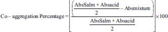where Abs3 hours represents the absorbance at 650 nm after 3 hours of incubation, and Abs0h represents the absorbance at 650 nm at the start of incubation (0 hour) (Tuo et al., 2013). Co-aggregation assayThe selected bacteria were cultured in MRS broth and incubated at 37°C under microaerophilic conditions for 20 hours. In addition, an aliquot of Salmonella sp. was cultured in TSB broth (Difco, USA) and incubated at 37°C for 20 hours. Suspensions of lactic acid bacteria and Salmonella sp. were prepared in PBS 1× as described in the auto-aggregation assay, considering an OD650 of 0.29 ± 0.05 for Salmonella sp. Subsequently, 1 ml of the suspension of each evaluated bacterium was mixed with 1 ml of Salmonella sp. suspended in PBS 1×. The mixture underwent vortex agitation and was incubated at 37°C for 3 hours. The absorbance was then measured at 650 nm. The percentage of co-aggregation was calculated as follows: