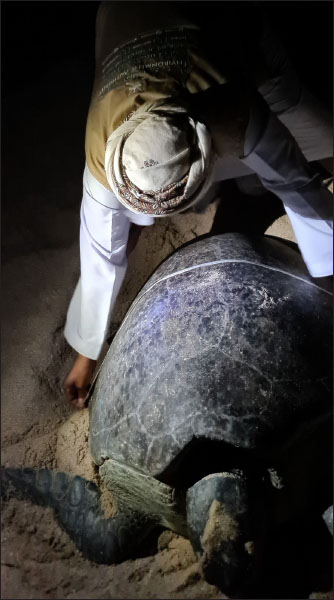 Fig. 6. Female green turtle (Chelonia mydas) measured by a ranger of the Environment Authority at Ras Al Hadd, Sultanate of Oman. (Photo by M. Giangaspero).