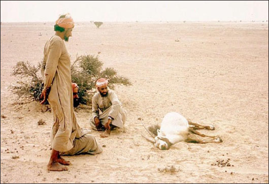 Fig. 11. Rangers looking at an hunted Oryx, after chasing poachers. Arabian Oryx Reserve, Al Wusta Directorate, Sultanate of Oman, 1996. Source: Office for conservation of environment. Other threats that require effective preventive actions include the degradation of the natural environment due to human activities, such as the exploitation of natural resources, like fossil fuels as it is the case in Oman for oil and natural gas extraction, with subsequent pollution, reducing and hampering habitats where wild fauna lives, or climate changes that might alter the complex equilibrium of deserts and sea. Current Initiatives and Future ProspectsThe delicate equilibrium of wild fauna in Oman requires to be studied and supported. Two main areas of research and intervention refer to the reintroduction of the ungulates held in captivity at the Oryx Sanctuary into the natural environment, and the second field of interest is the protection and improvement of reserves dedicated to sea turtles. As demonstrated by previous surveys, the potential for a high density of wild ungulates, such as gazelles, relies on well protected and productive habitats, to avoid decline due to most likely a result of poaching and competition with domestic livestock (Al Jahdham et al., 2017). This implies the preservation of natural areas suitable to sustain wild populations or to receive animals breed in captivity for repopulation, including fighting against poaching and preventing the spread of diseases from domestic animals. For example, field observations allowed us to identify the natural habitat of the Nubian ibex in Oman, a restricted area close to the Arabian oryx sanctuary, on the mountains between Haima and Duqm in the Al Wusta governorate. Nevertheless, recent mining activities started in this area, hampering this identified precious territory. It is, therefore, important to issue specific legal provisions (in line with the empowerments of the Environment Authority) to preserve intact the ecosystem of the Nubian ibex and other wild species that existed in that particular area to avoid its disappearance. In addition, only limited information is available on diseases occurring in these species (Goraya et al., 2021). On their husbandry and management requirements (this included the consideration of green products, guaranteed against poaching and illegal trade, such as the recuperation of antlers from deceased antelopes), as well as repopulation strategy; therefore, research should be undertaken on these topics. For example, protocols for rapid release in the wild should be studied, eventually considering the constitution of animal groups after weaning, for a pre-adaptation period to natural feeding to facilitate animals ready for self-sustaining upon release, considering that captive animals are fed with forage and supplemented with concentrates and salt (Fig. 13). Similarly, studies should be conducted for the selection of areas to be repopulated and the measures to be taken to protect reintroduced animals in selected territory (water points, ranger monitoring, legal instruments). Concerning domestic animals, 70% of Omani domestic animals are present in Dhofar (Ministry of Agriculture, 2011; FAO, 2021), due to the favorable climate and availability of large pastures. The 225,000 bovines ( Bos taurus, Linnaeus, 1758) and the 187,000 dromedaries ( Camelus dromedarius , Linnaeus, 1758) constitute the majority of the zootechnic resources of the region, along with less than 100,000 goats ( Capra hircus, Linnaeus, 1758) and donkeys ( Equus asinus, Linnaeus, 1758) (data not published). No prophylactic programs are in place, and farmers are culturally averse. Pastures are freely shared by the different domestic species (Fig. 14). Therefore, due to promiscuity, no barrier exists to impede the spread of diseases among them. Also, natural reserves are used as pastures by farmers. Thus, diseases may spread indirectly from domestic animals to wild fauna. In addition, the high density of domestic animals may represent an epidemiological risk factor, facilitating the circulation of diseases. This may have an impact on animal health in the rest of the county. Even if the trade of live animals from Dhofar to other governorates might be limited, only a few animals are sufficient to introduce pathogens in hosting animal herds.