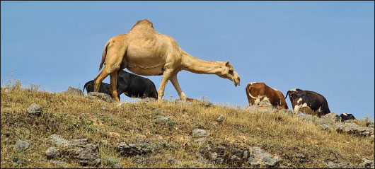 Fig. 14. Pastures in Dhofar, freely shared by cows and dromedaries. (Photo by M. Giangaspero). Concerning health problems observed on green turtles, only a few observations have been made at the Ras Al Hadd and Ras Al Jinz reserves. Some parasites were found on skin and shell; severe limitation of movement was observed due to the non-functioning or deformation of flippers in some turtles and diarrhea (watery and green) associated with fatigue was also observed. Mortality in adults is ascribed to fishing activities: shocks with boats, trapping into fishing nets, especially those positioned near the shore (only one time, it has been observed by the rangers the capture of 8 young individuals of 30 cm size and two adults). In addition, landing on a rocky beach is dangerous for adult females. In young turtles, mortality is due to cats, foxes, and crabs, as observed by the rangers of the Environment Authority, in force at the Ras Al Hadd turtle station. Seagulls predate only with sufficient moonlighting, for both adults and young; a behavioral risk is represented by moving toward the interior of the land at arrival or after eggs deposition and for young at hatching due to attraction by strong white lights. Out of 200 adults arriving per night, 8–9 females proceed in the wrong direction and need assistance. Two-three staff bring the turtle to the sea. In peak period, the assistance may be required even for 20 adults daily, since much more turtles arrive, up to 600 per night. If the animal is not helped, it will die in the morning (9 am) since 3 hours are sufficient to determine severe and irreversible lesions at the level of the fat accumulated under the upper shell. If the turtle is turned belly-up, it can resist for two days. This problem can be minimized by the control of lighting and the construction of walls, which are present but do not cover the entire site. However, exceptions made to some observations, and no data, especially on mortality, are available on occurrence and causes. No samples have been collected in the past 15 years, and no veterinarians are in place, resulting in a complete lack of knowledge on pathogens affecting turtles. Concerning sea turtle risk areas, two lagoons are located near Al Ras Hadd. Turtles spend about 2 months in their calm waters. The only problem observed was the excessive colonization of the shell by algae inducing difficulties in movement. However, other areas seem problematic for turtles, as natural traps are in certain areas along the coast. At the proximity of Filim, in an area designated as a natural reserve in 2014, between Sur and Duqm, several turtle remains (skulls, shells, and bones) can be observed on the shore in a certain unusually high number. Turtles might be tricked by the tide, entering very low deep water zones and then trapped with the ebbing tide, unable to recover the sea and eventually dying from dehydration, suggesting that the area represents a natural threat to turtle survival, and corresponding to a particular topography, as revealed by satellite images (Fig. 15). Therefore, it would be worthwhile to investigate and explore the real extent of the problem and find solutions with effective measures to prevent turtle mortality. Research projects should be organized to cover the abovementioned topics, requiring dedicated human resources, equipment, and consumables for variable periods according to the complexity of planned activities and expected results. Partner institutes and authorities might be involved as necessary. For example, research institutes reference for specific diseases and the Ministry of Agriculture for matters referring to domestic animals at risk of negative influence on reintroduced wild animals. For wildlife ungulate animals, project objectives might be the review of common diseases in the captive animals at WWR, focusing on three flagship species with important conservation value: Arabian oryx, Arabian sand gazelle, and Arabian gazelle. Project activities should focus on the screening of viral, bacterial and parasitic diseases to improve the health and welfare of captive animals and study and identify best practices for preparing animals to be released in the wild to sustain an effective repopulation strategy. For turtles, project objectives might be the collection and analysis of samples to identify pathogens, toxic agents, and contaminants in sea turtle species present in the Omani waters, focusing on the green turtles, as the most abundant in the area, that might be considered bio-markers taking into account their longevity. Other project objectives might aim to improve the health and welfare of females during deposition season and young at hatching and any other turtle with health problems and ensure better protection of the reproduction sites.