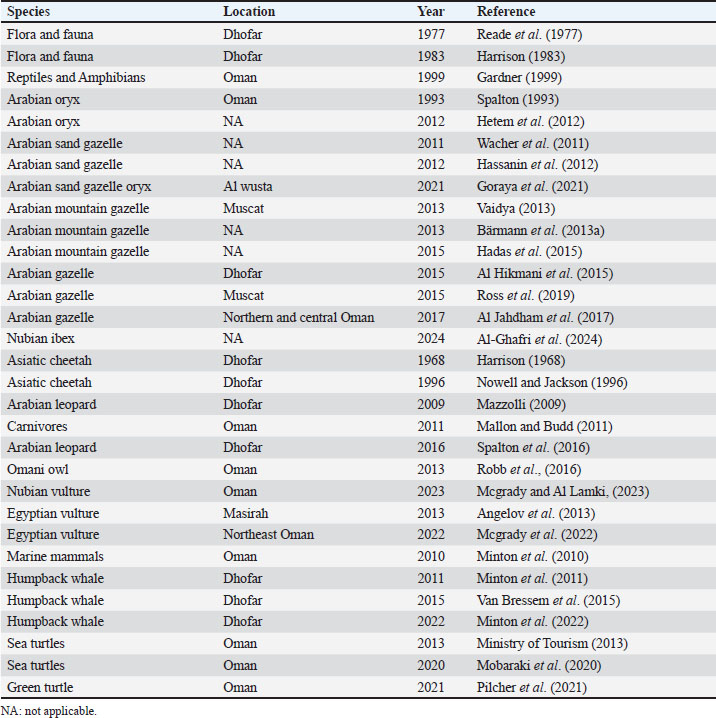 AbstractIn order to achieve optimal health for humans, animals, and our environment, the ‟One Health” approach proactively engages various disciplines, including environmental health sciences, veterinary medicine, and human medicine. Therefore, wildlife conservation assumes a relevant role in this context. The Sultanate of Oman is a country with an immense biodiversity. In recent decades, authorities have actively protected wildlife and the natural environment. In 1994, the Arabian Oryx Sanctuary was created under the patronage of the Royal Diwan. The Environment Authority was recently established, and the plan “Vision 2040” was conceived with the ambitious goal of Oman becoming one of the top 20 countries for wildlife protection. Two species, in particular, show the amplitude of the efforts necessary to preserve this natural heritage and their survival: the oryx of Arabia and the green turtle. The oryx is not only a national symbol but, from extinction in nature, its return is also a success for the Omani sanctuary. The green turtles elected the Omani coasts as the second reproduction site in the world. Therefore, the delicate equilibrium of wild fauna in Oman is required to be studied and supported. Keywords: Preservation, Sultanate of Oman, Vulnerable species, Wild fauna. IntroductionThe Sultanate of Oman is a country that surprises by its extraordinary diversity of exceptional animals. Oman’s varied landscapes and unusual climatic conditions have created an extraordinary biodiversity. Oman is home to one of the most diverse ecosystems in the world. Peaceful sea giants emerge along its shores, and unique wild animals have settled in its mountains and deserts. For the animals, life in Omani’s mountains is a challenge in itself, but some have been able to develop special skills to withstand the hostile conditions of this ecosystem. The most spectacular and charismatic animal of Oman is undoubtedly the Arabian leopard ( Panthera pardus nimr, Hemprich and Ehrenberg, 1833), one of the smallest species of leopard in the world (Spalton and Hikmani, 2014). The mountains are home to other rare species, such as the striped hyena ( Hyaena hyaena, Linnaeus, 1758), which is of modest size and has a declining population (CBD, 2014). At the turn of the rare water points, meet the most different creatures and the shallow waters are the playground of the humpback whale ( Megaptera novaeangliae, Borowski, 1781) of the Arabian Sea. Historically, in Oman was present also the Asiatic lion ( Panthera leo persica, Meyer, 1826) (Mallon and Budd, 2011). However, severe changes occurred in the region, showing changes in the fauna of Oman, especially in the context of the last century. The disappearance of selected species such as the Arabian oryx ( Oryx leucoryx, Pallas, 1777), in 1972 (Spalton, 1993), and the Asiatic cheetah ( Acinonyx jubatus venaticus, Griffith, 1821), in 1977 (Harrison, 1983), were indicative of these marked changes and serious threats affecting the natural environment of the country. Fortunately, for the Arabian oryx, it was possible to reintroduce, at least in captivity, the animal in the country (Spalton, 1993). Field observations and scientific studies have been undertaken about Oman’s wildlife, producing some literature and publications. Despite past studies, Oman remains a country of wild nature still largely unknown. The present article aims to provide an overview of the value of the wild fauna in the Sultanate and indicate conservation efforts and future prospects to address threats and challenges, with particular attention to the Arabian oryx and sea turtles. Study RegionThe Sultanate of Oman is a relatively wide territory, with about 300,000 square km, in the south of the Arabian Peninsula, characterized by two main tracts: the arid desert and rocky mountains and the long coastline on the Arabian Sea, the northwestern section of the Indian Ocean. Exception made for the microclimate specific to the south occidental area of the governorate of Dhofar, capital Salalah, one-third of the country neighbor to the border with Yemen, where rainfall (annual average of 250 mm) allows luxuriant vegetation and it is favorable to agriculture; the rest of the country is characterized by a subtropical dry climate, with an average of annual rainfall 59 mm and temperature average of 27°C, from 25°C in January and 40°C in June (but temperature may exceed 50°C) (Ministry of Agriculture, 2011; World Bank, 2021). A large part of the territory consists of arid surfaces and desert expanses. The Rub Al Khali (Grob Al Ain or Empty Quarter), the world’s largest continuous sand desert (https://earthobservatory.nasa.gov/), covers the southern part of the peninsula. Still, some areas challenge dryness with landscapes as surprising as the fauna present. Mount Samhan (Jabal Samhan), located in the mountains of Dhofar is one of these places. The long coastal plain is surmounted by mountains that rise to 1,000 m. Oman benefits from a strategic position at the intersection of Africa, Asia, and Europe. Its coastline opens to the north of the Indian Ocean. Its geographical peculiarities offer areas of rest much appreciated by migratory birds, and local species also find their well-being. The secret of this diversity is the wind. With summer comes the khareef, the monsoon. The monsoon season starts from June until September, leading to heavy and beneficial rainfalls, especially encountering high mountains. From the Indian Ocean, it blows toward the land and sweeps the mountains of Dhofar. This explains why the region of Dhofar accounts for 80% of Oman’s biodiversity and probably the Arabian Peninsula. In addition, tropical cyclones seldom contribute to heavy rainfalls, as the cyclone Tej which was expected to unleash 200 to 300 mm of rain in Dhofar governorate in 3 days, in October 2023 (Gulf News, 2023). In addition, in the Hajar northern mountains, located on the northeast corner of the Arabian