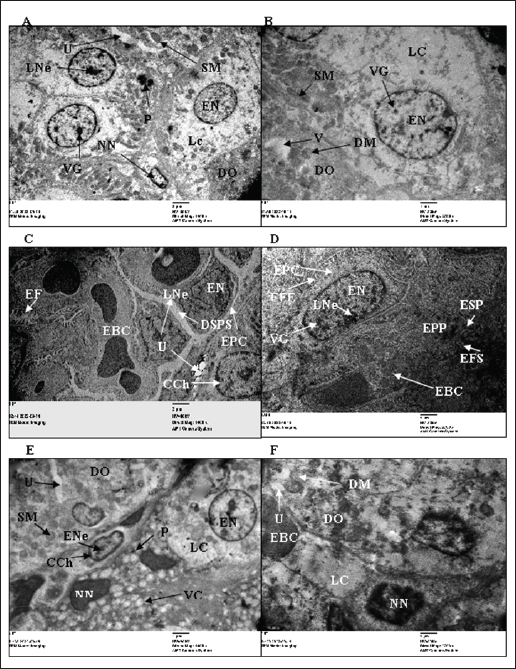 Fig. 3. TEM micrograph of the kidney cortex components of a treated wild rat indicating elongated nucleus (EN), necrotic nucleus (NN), vesicular granules (VG), condensed chromatine (CCh), swollen mitochondria (SM), Damaged mitochondria (DM), lytic cytoplasm (LC), degeneration of the cytoplasmic organelles (DO), marked dilation with inflammatory cells (IC), vacuolation of the cytoplasm (VC), ulcers (U), pigments (P), enlarged PC (EPc), glomerular capillary comprises enlarged FS (EFS), enlarged BC (EBC), enlarged PP (EPP), enlarged SP (ESP) and enlarged fenestrated endothelium (EFE). (A) and (B) shows the kidney cortex of a treated rate exposed to 2% urea + camphor oil at 10% (X 1,400, 2,700, respectively). (C) and (D) shows the kidney cortex of a treated rate exposed to 2% urea (X 1,400, 2,700, respectively). (E) and (F) shows the kidney cortex of a treated rate exposed to 10% camphor oil (X 1,400, 2,700, respectively). Alkalinity, nitrates, and ammonium are raised in the water samples that contain urea and camphor oil addition, and these are by Davies (2005) and Peterson (2008). The alkalinity range (20 mg/l) in the present investigation was not advised, as recommended by ANZECC and ARMCANZ (2000), Sithik et al. (2009), and Khater and Ibraheim (2016). Histopathological studiesEstimation of blood parameters of wild ratsThe present investigation indicated slight modifications in all blood parameters for control and exposed rats, and this coincided with the results of Hanafy et al. (2013), Khater and Ibraheim (2016), Hamed et al. (2023), and Oktanella et al. (2023). Ultra-structural studies on the wild rats' kidneySuch studies indicated the hazardous effects of urea and camphor oil on the experimental wild rats, as they damaged the kidney tissues of the investigated rats, causing dysfunction and kidney ulcers. They harm the renal tissues, forming kidney disappointment and putrefaction, and this concurred with the results of Dar et al. (2017) and Kong et al. (2017). ConclusionThe present investigation indicated that increasing the concentration of urea and camphor oil reduced the amount of water intake by R. norvegicus rats and caused an increase in the mortality of wild rats. Moreover, the post-treatment of rats by mixing urea with camphor oil after the treatment with urea only induced the highest effect on the mortality of rats, which indicates a synergistic activity of the two agents compared to the treatment with each agent separately. AcknowledgmentsThe authors greatly thank Prof. Dr. Magdy Wilson, Professor in the Harmful Animals Research Department, Plant Protection Research Institute, Egypt, for his support and encouragement during the completion of the manuscript. The authors greatly thank Prof. Dr. Abdel Monem Khalil for his critical reading of this paper. Data availabilityAll data will be made available upon a reasonable request. Conflict of interestThe authors have no competing interests. FundingThere is no funding for authors. Author contributionsZeinab Z.K. Khater and Hend Sh. Ghareeb are responsible for everything in the research. ReferencesAmbasht, R.S. and Ambasht, P.K. 1990. Environment & Pollution: An Ecological Approach. Book, CBS Publishers & Distributors (4) Pvt. Ltd., ISBN 13: 9788123912233, pp: 323. Annateresa, P., Xavier, A.C., Louise, L., Fadi, J.C. and Paul, A.L. 2013. Salt loading in canola oil fed SHRSP rats induces endothelial dysfunction. PLoS One 8(6), e66655. ANZECC and ARMCANZ. 2000. Australian and New Zealand Guidelines for Fresh and Marine Water Quality. National Water Quality Management Strategy (NWQMS), pp: 314. Beshay, R.M. 2005. Biological and toxicological studies on some rodents. Ph.D. Thesis, Faculty of Agriculture, Benha University, pp: 173. Bignell, C.M. and Dunlope, P.J. 1996. Volatile leaf oils of some South Western and Southern Australian species of the genus Eucalyptus. Part VII. Subgenus Symphyomyrtus section. Excert. Flav. Fragr. J. 11, 35–41. Bonnefoy, X., Kampen, H. and Sweeney, K. 2008. Public health significance of urban pests. World Health Organization, Regional office for Europe, pp: 387–419. Boyd, C.E. 1990. Water quality in ponds for aquaculture. USA: Alabama Agriculture Experiment Station, Auburn University. Daniels, M.J., Hutschings, M.R. and Greig, A. 2003. The risk of disease to livestock posed by contamination of farm stored feed by wildlife excreta. Epidemiol. Infect. 130, 561–568. Dar, M.A., Sultana, M., Mir, A.H., Raina, R. and Prawez, S. 2017. Effect of repeated oral administration of roundup and ammonium nitrate on liver of wistar rats. Proc. Natl. Acad. Sci. 89, 505–510. Davies, P.S. 2005. The biological basis of wastewater treatment. Strathkelvin Instruments Ltd., pp: 1–20. Dedovic, S., Vuksa, M., Petrovic, M.M., Bojkovski, J., Pavlovic, I., Jokic, G. and Stojnic, B. 2012. Control of brown rat (Rattus norvegicus) on a dairy farm in Serbia. Biotechnol. Anim. Husband. 28(3), 623–633. Dietrich, E.L., Syed, M.N., Mohamed, Y.H., Kamil, K. and Georg, A.P. 2020. Combined pre-and post-treatment of paraoxon exposure. Molecul. 25, 1521. Edwards, P.B., Wanjura, W.J. and Brown, W.V. 1993. Selective herbivore by Christmas beetles in response to intraspecific variation in Eucalptus terpenoids. Oecol. 4, 551–557. El-Hilaly, J., Israili, Z.H. and Lyoussi, B. 2004. Acute and chronic toxicological studies of Ajugaiva in experimental animals. J. Ethnopharmacol. 91(1), 43–50. Fakir, L., Bourhia, M., Salamatullah, A., Alzahrani, A., Ullah, R., Ezzeldin, E., Mostafa, G. A., Bari, A., Alaoui, T., Gmouth, S., Benbacer, L. and Abdelhamid, Z. 2021. Acute and repeated dose 60-day oral toxicity assessment of chemically characterized Berberis hispanica Boiss. and Reut in Wistar rats. Open Chem. 19, 686–695. Fanucchi, M.V., Bracher, A., Doran, S.F., Giuseppe, L.S., Fernandez, S., Edward, M.P., Larry, B. and Sadis, M. 2012. Post- exposure antioxidant treatment in rats decreases airway hyperplasia and hyperreactivity due to chlorine in