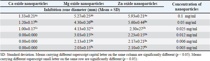 Summarized results in Table 4 showed the effects of different concentrations of various nanoparticles on E. coli inoculated into UHT milk stored at cold storage (4°C ± 1°C) on the 3rd day. Data revealed that the most effective concentration of zinc oxide, MgO, and CaO nanoparticles was 0.1 mg/ml with mean counts of 3.06 ± 0.000, 2.82 ± 0.002, and 2.74 ±0.002 (log10 cfu/ml). Results in Table 5 point out the impact of the storage temperature and zinc oxide nanoparticles concentrations on E. coli inoculated into UHT milk stored over 3 days. DiscussionInorganic metal oxide nanoparticles such as ZnO, CaO, and MgO gain great attention as they are not only constant under strict process, but also their antimicrobial role gains clear importance for their probable application in the dairy branch (Vasilache et al., 2011; Husen, 2017). The obtained results of the current study revealed that the highest concentration of ZnO evolved the best results. ZnO nanoparticles with concentration (0.012 mg/ml) also exhibited a high inhibition zone 2.23 ± 0.153 which is in line with other reports (Vasilache et al., 2011; Bai et al., 2015). They found that 15 μg/ml zinc oxide nanoparticles had a significant effect against E. coli. Zinc oxide nanostructures are global antimicrobial compounds and are regarded bio-safe and nontoxic. The antibacterial efficacy was previously examined using agar well diffusion assay at higher concentrations (compared to our work) (256, 128, 64, 32 mg/ml) of ZnO NPs. The findings of the study revealed a higher reduction in E. coli counts (12.66 ± 0.66 mm) (Navale et al., 2015). In contrast, higher concentrations of ZnO (0.5 and 2 mM) did not exhibit an inhibitory zone on E. coli, according to Mirhosseini and Firouzabadi (2013). In contrast, the inhibition zone against E. coli for 5 and 10 mM of ZnO was 12 mm. The outcomes of our experiment matched those of Abdulrahman and Nssaif (2016). Table 4. Impact of different concentrations of various nanoparticles on viability of E. coli inoculated in UHT milk stored at (4˚C ± 1˚C) and (25˚C ± 1˚C) on the 3rd day.
