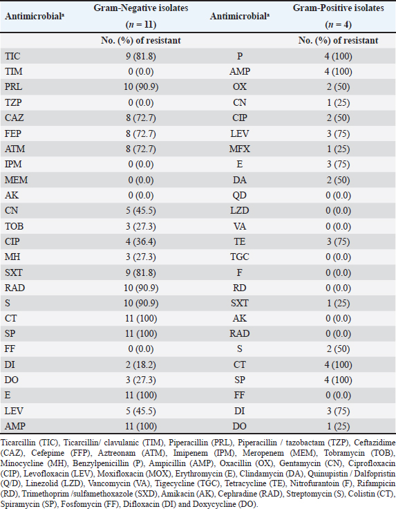 Figure 3. Heatmap representation of isolates source and antimicrobial resistance patterns. In this study, the examined livers yielded 46 bacterial isolates identified as follows Staphylococcus spp (52.17%), E. coli (41.30%), and the least percentage of 2.17% for E. casseliflavus (S. enterica subspecies arizonae and E. cloacae complex). These results were obtained by Bisgaard (1981) who isolated a higher percentage of Staphylococcus species than E. coli from ducks (Mallard, Muscovy, and white Pekin) at the age of 55 days. Also, partially agreed with Safwat et al. (1986) who isolated Salmonella, E. coli, Enterobacter species, and Pasteurella multocida from the internal organs of 150 balady ducks (4 weeks old) at a percentage of 19%, 15%, 13.3%, and 5%, respectively. The inability to isolate Pasteurella in our study may be due to medicated or vaccinated flocks. The second highest percentage of isolated bacteria in this study was E. coli (41.30%). This result was agreed with Asway and Abd-El latif (2010) who isolated E. coli from the internal organs of ducks with a higher percentage in the liver (42.5%). Table 2. Resistant proportions of 15 isolates from ducks with enteritis.
