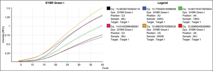 Fig. 1. Amplification curve using the SYBR Green method using the chuA primer. Color Description: Red: 3KJ, Black: 4KJ, Orange: 6KG, Green: 19KG, Blue: 20KG, Yellow: 5KGB. Amplification stages of the qPCR process using Go Tag qPCR Master Mix (Promega), PCR amplification usually uses 35–40 cycles (Maulani et al., 2020), but in this study, 40 cycles were used. This is because in cycle 40 there is amplification of the DNA sequence. Go Tag qPCR Master Mix (Promega), forward primer, reverse primer, nuclease-free water, and DNA (Promega, 2023). Next, the mixture is vortexed, which aims to help mix the solution perfectly (Nurhayati and Darmawati, 2017). The melting curve occurs at a temperature of 95oC for 5 seconds, at a temperature of 60oC, and at a temperature of 97oC, the melting curve aims to determine whether there are mutations or single changes in the DNA nucleotide bases (Tong and Giffard, 2012). In this study, the total number of qPCR cycles was 40 times. Based on data in Table 3, the qPCR results of the enterohaemorrhagic invasive species E. coli 0157:H7 chuA gene identified sample 3KJ with a Cq of 14.61, sample 4KJ with a value of Cq 15.98, sample 6KJ with a value of Cq 12.20, sample 19KG with a value of Cq 14.90, sample 20 KG with a value of Cq 13.77, and sample 5KGB with a Cq value of 12.46. The test results are in the form of an amplification graph which can be seen in Figure 1. showing the results of the test amplification curve. The blue curve of the E. coli 0157:H7 chuA gene indicates the presence of the chuA gene or E. coli 0157:H7 DNA. The curve will be active if the enterohemorrhagic invasive species E. coli 0157:H7 chuA gene DNA is detected during the amplification process. chuA functions to detect the target DNA that you want to read. The intersection point between the sigmoid graph and the baseline threshold when reflected on the x-axis (cycle) is the threshold cycle (Ct) for the amplified sample (Pestana et al., 2010). In the amplification curve for testing the enterohaemorrhagic invasive species E. coli 0157:H7 chuA gene, the sigmoid graph intersects with the baseline threshold in the cycle (14.61, 15.98, 12.20, 14.90, 13.77, 12.46). The results of the increase in fluorescence are depicted through an amplification curve which shows three phases, namely the initial phase, exponential or peak phase, and plateau or stable phase (Vaerman et al., 2004: Zilhadia et al., 2017). In real-time PCR testing produces around one billion DNA molecules. The data obtained is in the form of purity DNA and the graph shows the presence of DNA of the chuA gene as a gene encoding the enterohemorrhagic invasive species E. coli in fecal samples of working horses on Sumbawa Island using RT-PCR. All samples in this study were amplified with varying increases but were still in a small range. This increase shows and describes the number of products amplified in each sample. The 5KGB sample curve experienced the highest increase while the 3KJ sample curve experienced the lowest increase. This shows that the 5KGB sample has the highest number of amplified products, while the 3KJ has the lowest number of amplified products. The results of testing samples on working horse feces showed that there were amplified samples, indicated by the quantification cycle (Cq) value). From the test results of 52 working horse feces samples, six sample isolates showed an increase in the amplification curve. The amplified samples have Cq values that are different from each other. The sample with the highest Cq value in detecting the chuA gene of the invasive enterohemorrhagic species E. coli 0157:H7 is shown in sample code 4KJ with a Cq value reaching 15.98. Meanwhile, the lowest Cq value was shown in the 6KG code sample with a Cq value reaching 12.20. qPCR uses fluorescence dyes and fluorescence probes. In this study, a fluorescence dye was used, namely a hydrolysis probe (TaqMan probe) using specific oligonucleotides that are complementary to the DNA to be amplified. The fluorescent hydrolysis probe will glow when the reporter and quencher are separated through hydrolysis due to nuclease activity. The hydrolysis probe works specifically and can prevent the occurrence of primer-dimers and mispriming, thereby causing non-specific amplification products (Zilhadia et al., 2017).