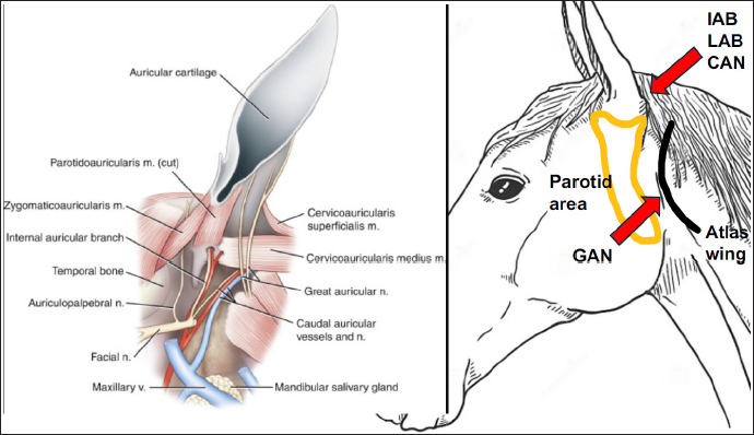 Fig. 1. After palpating the cranial aspect of the atlas wing, the GAN and its branches were localized, and the first injection of 0.5% ropivacaine (6 ml) was performed. A second injection at the caudal base of the ear was performed to block the IAB, LAB, and CAN. The needle was inserted through the skin once the parotid gland was palpated, then it was advanced in a sagittal direction, parallelly to the ear canal until its tip was just above the parotid gland (about 2 cm deep). When medio-lateral twitch of the pinna was well elicited at a current of 0.4 mA, 6 ml of 0.5% ropivacaine was slowly administered. Case DetailsAn 8-year-old Italian jumping gelding presented for ECT to treat a fibroblastic sarcoid in the left medial pinna. The medical history was unremarkable, except for the tumor; the preanesthetic physical examination revealed a physiological systolic aortic murmur and complete blood analyses displayed no abnormalities. After obtaining owner’s consent, the horse’s weight was estimated at 600 kg using a weight tape wrapped around its girth, directly behind the elbow. Being the horse’s temperament agitated, 25 mcg/kg of acepromazine (Prequillan, 10 mg/ml, Fatro SPA, Italy) was intravenously (IV) injected, and a 14-gauge IV catheter (Introcan safety, BBraun, USA) was placed in the left jugular vein. After 40 minutes, the horse was conducted to the box and premedicated with butorphanol (0.05 mg/kg IV, Dolorex 10 mg/ml, MSD Animal Health, USA), and romifidine (60 mcg/kg IV, Sedivet 10 mg/ml, Boehringer, Germany). The sedation was effective, and the horse was standing with a minimal degree of ataxia that completely disappeared after a few minutes. Following the disinfection of the auricular area, a block of the GAN (Fig. 1) was blindly executed as described by Cerasoli and colleagues (2017): after palpating the cranial aspect of the atlas wing, the GAN and its branches were localized, and the first injection of 0.5% ropivacaine (Ropivacaina 7.5 mg/ml, Bioindustria, Italy) was performed. Six ml of the local anesthetic was slowly administered subcutaneously using a 21-gauge needle (Sterican 0.8 × 50 mm, BBraun, USA). Afterward, a second injection at the caudal base of the ear was performed to block the IAB, LAB, and CAN (Fig. 1) using an electrical nerve locator (Stimuplex HSN 12, BBraun, USA). The needle was inserted through the skin once the parotid gland was palpated, then it was advanced in a sagittal direction, parallelly to the ear canal until its tip was just above the parotid gland (about 2 cm deep). When medio-lateral twitch of the pinna was well elicited at a current of 0.4 mA, 6 ml of 0.5% ropivacaine was slowly administered through an insulated needle with an extension set (Stimuplex D 22G × 80 mm, BBraun, USA). The total dose of ropivacaine administered was 0.1 mg/kg. After each injection, the area was gently massaged. The duration of the entire locoregional technique was 4 minutes and the technique was easily executed without any reaction of the horse. After 5 minutes, the electroporation started, and cisplatin was administered to the sarcoid. The horse tolerated the application of the high-voltage electric pulses, but he slightly shook his head when the chemotherapeutic drug was injected. The procedure lasted 9 minutes and it was safely performed without any difficulties. The horse completely recovered 75 minutes after sedation and was discharged from the hospital after 2 hours of observation. No complications were detected. DiscussionThis case report describes the sedation combined with the block of the internal and external pinna in a horse undergoing ECT to treat a sarcoid in the left medial pinna. The approach described by Cerasoli and colleagues (Cerasoli et al., 2017) was effective in successfully desensitizing the motor and sensitive components of the pinna and allowed them to easily and safely execute the ECT. In literature, there are few locoregional techniques desensitizing the equine ear: a ring block around the auricular base, which is often not tolerated by the horses and may result in an incomplete block (McCoy et al., 2007); a blind GAN and IAB block which involves two injection points (one at the base of the ear for the GAN and the other on the lateral side of the pinna, just above the parotid gland’s cranial border, for IAB) (McCoy et al., 2007). However, the success rate of this GAN block may be limited due to anatomical differences. The GAN travels dorso-ventrally starting from the second cervical vertebral nerve and ending at the base of the ear. In horses, the GAN path is characterized by a high inter- and intra-variance: two or three branches traveling either cranially or caudally to the cranial aspect of the atlas wings are reported, as well as further unpredictable bifurcations of these branches on the auricular pinna (Cerasoli et al., 2017). Using a more caudal approach to GAN, as in this clinical case, it can be assumed that the local anesthetic solution has more chances to completely bath all the branches of GAN, suggesting a better desensitization than that reported in the previously described blocks at the base of the ear (McCoy et al., 2007; Sommeraurer et al., 2013). The blind GAN and IAB block described by McCoy et al. (2007) was effectively used under ultrasound (US) guide to perform bilateral otoscopies in 23 horses (Sommeraurer et al., 2013). As the landmark for the IAB was the styloid process that is close to the parotid gland and guttural pouch, they reported that caution must be taken not to accidentally puncture these structures and advised the US evaluation before local anesthesia. In the current case, US guidance was not deemed necessary because our injection point for IAB was at the caudal auricular base, just above the parotid gland, lowering the risk of intra-parotid injection and the possibility of gland inflammation than the above-mentioned block. In the hectic pace of today’s practice or if a US machine is not avai