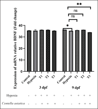 AbstractBackground: Oxygen deprivation (OD) is a critical condition that can lead to brain damage and even death. Current hypoxia management approaches are limited in effectiveness. Centella asiatica (CA), known for its neuroprotective properties, offers a potential alternative for OD treatment. Aims: This study aims to investigate the neuroprotective effects of CA on the expression of brain-derived neurotrophic factor (BDNF) and vesicular glutamate transporter 1 (VGLUT1) in zebrafish larvae under oxygen-deficient conditions. Methods: Zebrafish embryos were subjected to low oxygen levels (1.5 mg/l) 0–2 hours post-fertilization (hpf) until 3 days post-fertilization (dpf), simulating the early stages of OD. Subsequent treatment involved varying concentrations of CA (1.25–5 µg/ml) up to 9 days post-fertilization. The expression levels of BDNF and VGLUT1 were measured using PCR methods. Statistical analysis was conducted using a two-way analysis of variance to evaluate the impact of CA on the expression of BDNF and VGLUT1 in zebrafish larvae aged 3 and 9 dpf in oxygen-deprived conditions. Results: CA significantly influenced the expression of BDNF and VGLUT1 under OD (p < 0.001). An increase in BDNF expression (p < 0.001) and a decrease in VGLUT1 (p < 0.01) were observed in zebrafish larvae experiencing OD and treated with CA. There was no significant difference in BDNF and VGLUT1 expression across age variations in zebrafish larvae at 3 dpf and 9 dpf in the treatment groups (p > 0.05). CA concentration of 2.5 µg/ml effectively enhanced BDNF and reduced VGLUT1 in 3–9 dpf zebrafish larvae. Conclusion: CA demonstrates potential as a neuroprotective agent, modulating increased BDNF expression and reduced VGLUT1 under OD conditions. These findings lay a foundation for further research in developing therapies for oxygen deficiency. Keywords: Centella asiatica, Neuroprotective, Neurotoxicity, Neuroplasticity. IntroductionOxygen deprivation (OD)/hypoxic-ischemic (HI) injury has been reported in approximately 6 per 1,000 births globally, leading to chronic disabilities and high mortality rates. HI conditions result in perinatal brain damage, ultimately causing seizures, learning disorders, cerebral palsy, and epilepsy (Wang et al., 2021). OD can arise from factors such as pulmonary diseases, cardiac conditions, and high altitudes (Sydykov et al., 2021). Central and peripheral chemoreceptors respond to decreased oxygen pressure by signaling the respiratory centers in the medulla and pons. This initiates a cascade of processes that enhance pulmonary ventilation and cardiac output, which is crucial for maintaining normal human body functions (Chen et al., 2020). OD conditions are frequently used as models to study oxidative stress and neuronal damage (Lee and Jeong, 2021). Key biomarkers in neurodegeneration and neuroprotection studies include brain-derived neurotrophic factor (BDNF) and vesicular glutamate transporter 1 (VGLUT1). BDNF, a vital neurotrophic factor, plays a crucial role in neuronal survival and synaptogenesis, protecting against nerve damage and promoting the growth of new nerve cells. BDNF is expressed in various organs, notably the brain, by neurons and glial cells, especially astrocytes (Bazzari and Bazzari, 2022). VGLUT1 is responsible for transporting glutamate (an excitatory neurotransmitter in the brain) into synaptic vesicles (Wilson et al., 2005), and any malfunction in this system could contribute to a range of neurological disorders (Bathina and Das, 2015). In hypoxic conditions, the interaction between BDNF and VGLUT1 can collaborate to protect neurons from oxidative damage and maintain optimal neurotransmission function. These two proteins mutually support each other in preserving the balance and survival of nerve cells (Pietrancosta et al., 2020). In the last decade, research in neuroprotection has made significant strides, particularly in using natural compounds to safeguard brain function. Centella asiatica (CA) is recognized for its potent antioxidant, anti-inflammatory, and neuroprotective properties, attributed to its content of triterpenes, asiaticoside, asiatic acid, madecassoside, and madecassic acid (Sun et al., 2020). These natural compounds can aid in protecting nerves from damage caused by hypoxia (Hambali et al., 2021). This study aims to explore the effects of CA on zebrafish exposed to such conditions, focusing on the changes in BDNF and VGLUT1 expression, thereby providing a protective effect on the zebrafish brain under hypoxic conditions. Material And MethodsThe study was conducted between July 2022 and January 2023, involving the Faculty of Fisheries and Marine Science, as well as the Department of Biochemistry and Pharmacology at the Faculty of Medicine, Universitas Brawijaya, Indonesia. MaterialsOne hundred grams of CA powder underwent maceration in 900 ml of 98% ethanol for 24 hours, followed by filtration. This procedure was repeated three times, with the collected filtrates subsequently processed using rotary evaporation. The resulting extract amounted to 10 gm. The crude extract obtained from this process was transformed into a paste, subsequently diluted in normal saline, and preserved at a temperature of 0°C. AnimalsAdult zebrafish of both genders were accommodated in a 60–l glass aquarium, adhering to a sex ratio of two females for every male. The population density was maintained at 4–5 fish per square meter. Environmental conditions included a light/dark cycle of 14:10 hours and a temperature consistently controlled at 28°C ± 1°C. TetraMin Tropical Fish Flakes (USA) fed the fish twice daily. The collection of embryos began at the onset of the light period, and the egg water was renewed twice daily. The collected embryos, aged 0–2 hpf and characterized by a yolk sac, appeared transparent with a non-colored white hue, as observed by (Tran et al., 2023). Larvae at the age of 3 dpf were followed until they reached 9 dpf for subse