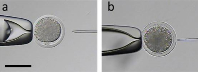 Fig. 1. Representative photographs of the beveled spiked micropipette used for conventional ICSI (a) and the flat-tipped micropipette used for Piezo-ICSI (b). Scale bar represents 100 μm. In oocytes fertilized with bovine sperm, the use of Piezo-ICSI increased the cleavage rate with respect to conventional ICSI (p < 0.05), but no blastocysts were obtained. However, conventional ICSI with chemical activation presented the highest cleavage rate, and blastocysts were obtained in this group. Although no differences in cleavage rates using conventional ICSI with bovine or human sperm were detected, the cleavage rate was higher using Piezo-ICSI with human sperm than with bovine sperm (p < 0.05; Table 2). Sham-injected oocytes disclosed 42%, 0 %, and 0% of cleavage and 12%, 0%, and 0% of blastocysts for conventional ICSI with chemical activation, conventional ICSI, and Piezo-ICSI, respectively (n=150 oocytes). Interestingly, Piezo-ICSI with human sperm increased the number of activated bovine oocytes as much as with conventional ICSI + chemical activation with bovine sperm, obtaining similar 2 PN formation and cleavage rates (Tables 1 and 2), but also considering that some of the latter oocytes are parthenogenetically activated ones (see sham-injected oocytes data). PLCɀ activity in bovine and human sperm cellsAs regards PLCɀ activity, significantly higher values were detected in human sperm compared with bull sperm (16.1 ± 4.4 and 5.2 ± 1.8 mIU/106 spermatozoa, respectively, p < 0.05, n=9 for each treatment in three replicates) (Fig. 3). DiscussionWe proposed that the bovine oocyte activation failure after ICSI may be in part due to the low PLCɀ release and/or activity in bull sperm. For this purpose, we used conventional ICSI and Piezo-ICSI with bull or human sperm to induce bovine oocyte activation, considering that fertilization with human sperm does not use chemical activation. Additionally, PLCɀ activity was determined in both bovine and human spermatozoa. Our results demonstrated that the use of Piezo-ICSI with bovine sperm can significantly increase the rates of 2 PN formation and cleavage in comparison with conventional ICSI using bovine sperm without any additional activation process for the oocyte. Similar results have been obtained in other small ruminants where the mechanical force exerted by the Piezo system on the sperm plasma membrane and acrosome substantially improved embryonic development (Anzalone et al., 2016). Unfortunately, these rates continue to be significantly lower than those obtained when performing the chemical activation of the bovine oocyte. In a coincidence, Devito et al. (2010by micromanipulation, of a single sperm into the cytoplasm of a mature egg. This technique is particularly advantageous when only a few sperm are available for fertilization, representing an important tool in preserving genetic material, especially from poorly fertile males. The results from ICSI in cattle are very often unsatisfactory and difficult to reproduce. Thus, the goal of this study was to evaluate the effect of the use of a Piezo drill (PD) reported that the independent use of Piezo or chemical activation was not enough to produce an adequate morulae formation, but when both techniques were combined embryos could develop to the blastocyst stage. However, as previously mentioned, bovine oocyte chemical activation has limitations. According to our sham test results, about half of the blastocysts obtained were parthenogenetically activated ones, and therefore unsuitable to produce calves, as other authors also reported (Keskintepe et al., 2002).
