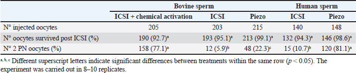 Open Vet. J.. 2024; 14(5): 1191-1198 Open Veterinary Journal, (2024), Vol. 14(5): 1191–1198 Research Article Bovine oocyte activation with bull or human sperm by conventional ICSI and Piezo-ICSI: Its relationship with PLCɀ activityGabriel Alvarez1,2, Sofia Villanueva3, Elizabeth Breininger1,4, Marisa Geller5, Claudio Ruhlmann2, Gabriel Dalvit6, Pablo Cetica1,4*† and Masashige Kuwayama7†1CONICET-Universidad de Buenos Aires, Instituto de Investigaciones en Producción Animal (INPA), Buenos Aires, Argentina 2Fertilidad San Isidro, Buenos Aires, Argentina 3Freelance Embryologist, Buenos Aires, Argentina 4Universidad de Buenos Aires, Facultad de Ciencias Veterinarias, Instituto de Investigación y Tecnología en Reproducción Animal (INITRA), Buenos Aires, Argentina 5In vitro Buenos Aires, Buenos Aires, Argentina 6Advanced Fertility Center Cancun, Cancun, Mexico 7Repro-Support Medical Research Center, Tokyo, Japan *Corresponding Author: Pablo Cetica. Universidad de Buenos Aires, Facultad de Ciencias Veterinarias, Cátedra de Química Biológica, Buenos Aires, Argentina. Email: pcetica [at] fvet.uba.ar †Equal senior contribution Submitted: 10/02/2024 Accepted: 25/04/2024 Published: 31/05/2024 © 2024 Open Veterinary Journal