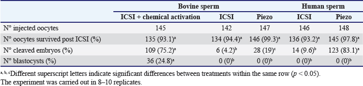 Table 2. Cleavage and blastocyst rates in oocytes activated using bovine or human sperm. Numbers in parentheses represent percentages.