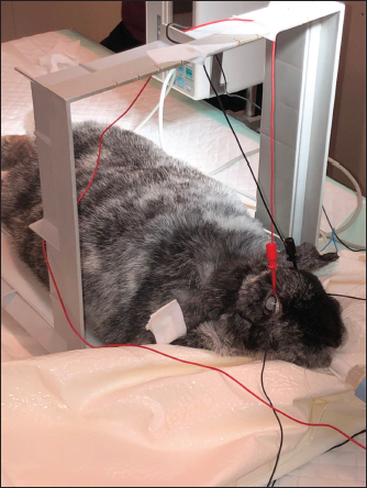 Fig. 2. Position of anesthetized rabbit and electrodes for electroretinographic examination. The electrodes were placed on each upper eyelid conjunctiva and subcutaneously, at the base of each ear and on the dorsal neck for the reference electrode. Postoperative managementImmediately after surgery, buprenorphine (Bupaq, VetViva Richter GmbH, Wels, Austria) 0.025 mg/kg, q6h, and meloxicam (Metacam, Boehringer Ingelheim Vetmedica GmbH, Ingelheim/Rhein, Germany) 1 mg/kg, q12 hours, were injected subcutaneously for 24 hours. Immediate postoperative topical medication was dexamethasone-neomycin sulfate-polymixin B sulfate eye drops (Maxidrol, Novartis Pharma S.A.S., Rueil-Malmaison, France), q8h. Feeding was resumed rapidly during the first 24 hours by force-feeding according to spontaneous food intake. During the first 24 hours, no post-operative ocular hypertension was noted OU, a very slight 1+ flare was observed OU with no particular discomfort and no corneal ulcers were present OU. The rabbit was discharged the day after the surgery with an Elizabethan collar. The oral postoperative treatment included meloxicam oral solution (Metacam, Boehringer Ingelheim Vetmedica GmbH, Ingelheim/Rhein, Germany) 0.5 mg/kg, q12h, for 5 days, tramadol hydrochlorhyde oral solution (Topalgic 100 mg/ml, Sanofi, Paris, France) 10 mg/kg, q12h, for 2 days and oral doxycycline hyclate (Doxyval 20, Ceva Santé Animale, Libourne, France) 10 mg/kg, q24h, for 7 days. The topical postoperative treatment included dexamethasone-neomycin sulfate-polymixin B sulfate eye drops (Maxidrol, Novartis Pharma S.A.S., Rueil-Malmaison, France), q8h, for 1 week then q12h for 3 weeks and hyaluronic acid-vitamin B12-trophic factors eye drops (Twelve TVM, Dômes Pharma, Lempdes, France) q8h, for 4 weeks. After 48 hours, the owner reported by telephone that the animal was eating well spontaneously, urinating and defecating normally. Outcome and follow-upFollow-up visits were carried out at 1, 3, and 12 weeks, then at 4, 8, and 12 months post-operatively. Between visits, the owner provided regular updates. A complete ophthalmologic examination was performed at every visit, including neuro-ophthalmologic evaluation, slit-lamp examination, rebound-tonometry, and fluorescein dye test. At the 1-week postoperative follow-up, tonometry was in normal values OU, no aqueous flare was noted and IOL was well-centered OU. A paracentral upper epithelial corneal ulcer was present in both eyes, a few millimeters below the keratotomy site. Dexamethasone-neomycin sulfate-polymixin B sulfate eye drops were therefore discontinued, replaced by tobramycin eye drops (Tobrex 0.3%, Novartis Pharma S.A.S., Rueil-Malmaison, France) q8h, for 2 weeks and hyaluronic acid-vitamin B12-trophic factors eye drops (Twelve TVM, Dômes Pharma, Lempdes, France) q8h, were continued for 4 weeks. At the 3-week follow-up visit, the epithelial ulcers were healed. Except for these bilateral corneal ulcers quickly healed, no other post-operative complications were observed. Follow-up examinations up to 1 year post-operatively revealed no inflammation, IOP in normal values OU, well-centered IOLs (Fig. 6), and normal fundus OU. Slight linear and vertical posterior capsular folds were observed OU at the 3-month visit, but no posterior capsular opacification (PCO) was present OU. At 8 and 12-month visits, these capsular folds were stable and no PCO was still observed (Fig. 6). The owner confirmed that the rabbit had normal autonomy and moved with accuracy, as observed during follow-up visits and on videos provided by the owner.