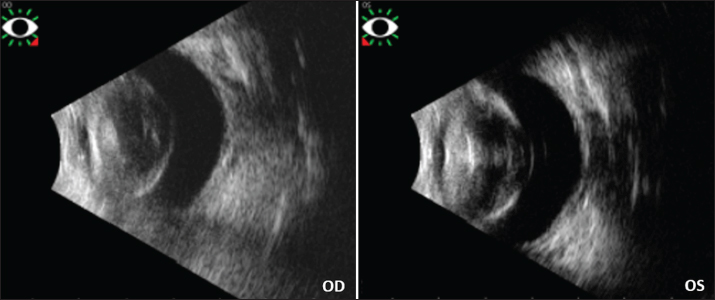 Fig. 4. Ultrasound images of the rabbit’s both eyes. Note for each eye the thickened and opaque lens, without lens displacement nor retinal detachment nor vitreous anomaly.