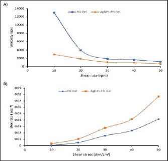 Fig. 4. A) Viscosity profile of FG and AgNPs-FG loaded hydrogels at different shear rates; B) Rheograms of FG and AgNPs-FG loaded hydrogels at different shear stress values.Fig. 5. Skin incision at the medial aspect of the proximal end of the right tibia with the injection of AgNPs-FG-gel at the bone defect (A), immediate postoperative lateral radiographs of bone defect at tibia + normal saline control group (group1) (B), bone defect at tibia + AgNPs-FG (group 2) (C), bone defect at tibia + plain gel (group 3) (D), and bone defect at tibia + FG-gel (group 4) (E). Postoperative (day 56) lateral radiographs of bone defect at tibia + normal saline, (group1) (F), Cranio-caudal radiograph of bone defect at tibia + AgNPs-FG (group 2) (G), bone defect at tibia + plain gel (group 3) (H), and bone defect at tibia + FG-gel (group 4) (I). Please note complete healing in (G) compared to other studied groups.