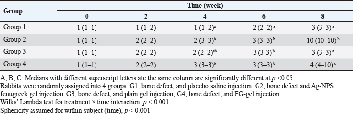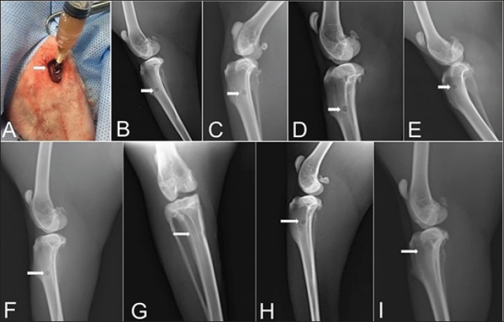 Fig. 5. Skin incision at the medial aspect of the proximal end of the right tibia with the injection of AgNPs-FG-gel at the bone defect (A), immediate postoperative lateral radiographs of bone defect at tibia + normal saline control group (group1) (B), bone defect at tibia + AgNPs-FG (group 2) (C), bone defect at tibia + plain gel (group 3) (D), and bone defect at tibia + FG-gel (group 4) (E). Postoperative (day 56) lateral radiographs of bone defect at tibia + normal saline, (group1) (F), Cranio-caudal radiograph of bone defect at tibia + AgNPs-FG (group 2) (G), bone defect at tibia + plain gel (group 3) (H), and bone defect at tibia + FG-gel (group 4) (I). Please note complete healing in (G) compared to other studied groups. Table 1. The median and range of the radiographic union score for bone defect healing in rabbits by the group.