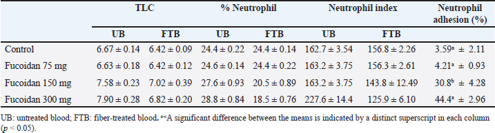 where the optical densities at time t 15 and t 0, respectively, are represented by OD 15 min and OD 0 min. Cyclophosphamide-induced myelosuppressionThis study aimed to investigate how fucoidan might inhibit myelosuppression induced by cyclophosphamide (Aljutaily, 2022). Five groups of Wistar rats, each with six rats made up the control groups, the cyclophosphamide groups, and the fucoidan groups. The rats in the control groups only received a saline solution, the rats in the cyclophosphamide group only received intraperitoneally cyclophosphamide at doses of 30 mg/kg BW, and the fucoidan group received orally fucoidan at doses of 75, 150, and 300 mg/kg BW for eleven days, and also received intraperitoneally cyclophosphamide at doses of 30 mg/kg BW on the eighth, ninth and tenth days, one hour after received fucoidan. On day eleven of the experiment, blood samples were taken and their hematological characteristics were examined. Analytical statisticsOne-way analysis of variance (ANOVA) and post hoc Tukey test was used to statistically assess the data, which were presented as mean and standard error mean (SEM), p < 0.05 indicated statistical significance in the difference. Ethical approvalAll trials were examined and approved by the Faculty of Veterinary Medicine at Airlangga University’s Ethical Approval Committee assessed this work, and it was given ethical approval under No. 1.KEH.081.06.2023. ResultsEffect of fucoidan on neutrophil adhesionThe number of neutrophils decreased when incubated with NFs fibers because the neutrophils adhered to the fibers. Table 1 shows how fucoidan affects neutrophil activation in the neutrophil adhesion assay. Administration of fucoidan only at doses of 300 mg/kg BW significantly elevated neutrophil adhesion when the data were compared to rats in the control group; however, this effect was not observed at dosages of 75 or 150 mg/kg. This data suggests that fucoidan has immunostimulant effects. Table 1. Effect of fucoidan on neutrophil adhesion in rats