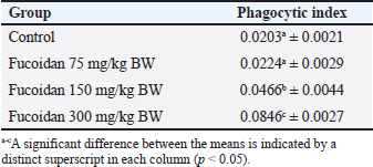 Phagocytic response (carbon clearance methods)The effect of fucoidan treatment on the macrophage was evaluated using a carbon clearance assay (Casas-Rodriguez et al., 2022). Rat is divided into control and treatment groups. Oral fucoidan at varying dosages (75, 150, and 300 mg/kg BW) was administered to treatment groups, while the control groups received 10 ml/kg BW of normal saline for 7 days. On the seventh day, an intravenous injection of 5 ml/kg BW of carbon suspension (1:50 dilution of Indian ink, Hi-Media Laboratories Pvt, Ltd., Mumbai, India) was administered. At 0 and 15 minutes after injecting colloidal carbon ink, blood samples were taken from the retro-orbital plexus, and lysed in 2 ml of 0.1% w/v sodium carbonate solution. Using spectrophotometry, the optical density was determined at 650 nm in wavelength. The phagocytic index was used to express the results:
