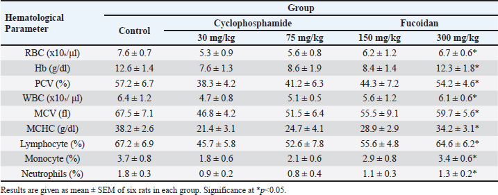 Effect of fucoidan on humoral immunityRat antibody production was assessed in response to oral fucoidan therapy using the SRBC haemagglutination titer. The humoral antibody titer value is shown in Table 2. Administration of fucoidan only at doses of 300 mg/kg BW resulted in a significant increase in haemagglutination antibody titer when compared with rats in the control groups. Effect of fucoidan on cell-mediated immunity (CMI)The DTH reaction, or foot pad reaction, was utilized to assess the cell-mediated immune response of the fucoidan. Table 3 shows that fucoidan significantly and dose-dependently boosted the DTH reactivity of rats. Administration of fucoidan only at doses of 300 mg/kg BW significantly elevated DTH reactivity when compared with control groups. The rat-increased DTH response to a cell-dependent antigen showed that fucoidan had activated T cells. Effect of fucoidan on phagocytic activityThere is a correlation between increased phagocytic activity and the speed at which carbon particles are removed. RES phagocytic activity was assessed by removing carbon particles from the bloodstream. The phagocytic index is shown in Table 4. When fucoidan is administered orally, the RES’s cells eliminate more carbon in a dose-dependent manner. Fucoidan demonstrated a significant phagocytic index when it was administered at doses of 300 mg/kg BW, but not at 75 and 150 mg/kg BW when compared with rats in the control groups. These results suggest the phagocytic activity of fucoidan. Effect of fucoidan on myelosuppression caused by cyclophosphamideCyclophosphamide, administered intraperitoneally at a dose of 30 mg/kg BW, significantly decreases hemoglobin, white blood cells, red blood cells, and platelets. When cyclophosphamide and fucoidan are administered together in a dose-dependent manner, bone marrow activity is restored more than when cyclophosphamide is administered alone. Hemoglobin, red blood cells (RBCs), WBCs, and platelet count were all markedly elevated by fucoidan at doses of 300 mg/kg BB in comparison to the group treated with cyclophosphamide (Table 5). Table 5. Effect of fucoidan on cyclophosphamide-induced myelosuppression.