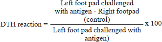 The neutrophil index of untreated blood samples is denoted by NIu, while the neutrophil index of treated blood samples is represented by NIt. Hemagglutinating antibody (HA) titerThe HA titer method was described by Sudjarwo et al (2018). There were four groups in the experimental models, each with six rats. On day 0, the rats in every group received an intraperitoneal injection of 0.1 ml of a suspension of 0.5×109 cells of SRBCs. In the treatment groups, fucoidan at varied doses (75, 150, and 300 mg/kg BW) was administered orally for seven days, whereas the control group of rats received 10 ml/kg BW of normal saline. On the seventh day, blood samples were taken from each rat’s heart to make the serum. Blood samples were centrifuged, and serum was extracted. The hemagglutination method was used to measure the antibody levels in 86 wells (12×8 flat-bottomed titer plates). A mixture of 25 µl serum and 25 µl normal saline was initially added to each well microtiter plate. The 25 µl diluted serum was then taken out of the first well and put into the second well to dilute the antibodies. Following the addition of 25 µl of 1×108 SRBC to each well, the microtiter plates were incubated for an hour at 37oC and then were checked for agglutination. DTH responseHamid et al (2020) method was used to calculate the DTH response. On day 0 of the immunization process involved injecting intraperitoneally 0.1 ml of a suspension of 0.5×109 cells of SRBC into the rats in each group. Rats were split into treatment and control groups. The control groups received 10 ml/kg BW of normal saline, while the treatment group received 75, 150, and 300 mg/kg BW of fucoidan orally for eight days. All of the rats received an SRBC challenge (0.5 x 109 cells) in the left hind foot pad on the seventh day of immunization. To control for nonspecific edema, the same volume of normal saline was injected into the right foot pad. The increase in footpad thickness was observed 24 hours following the challenge.