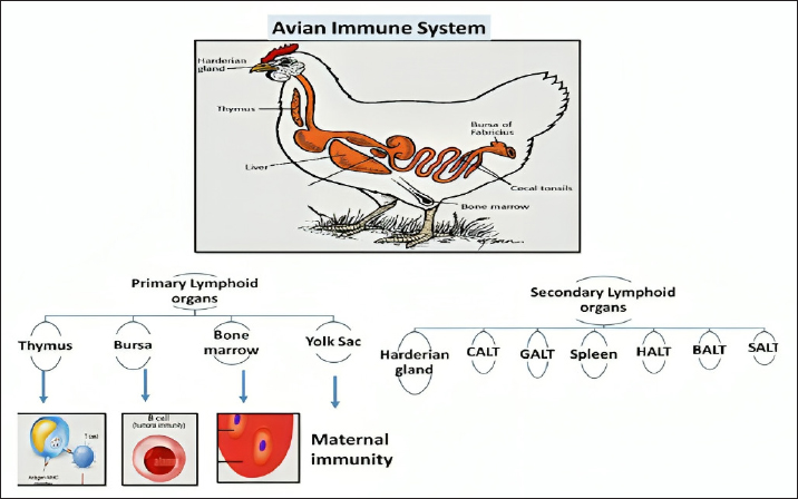Adaptive immunityThe adaptive immune system is another part of the bird’s immune system, which mainly responds to pathogen invasions and the development of tumor cells via a range of cells called antigen-specific lymphocytes. The response is initiated by the cells of the innate immune system, and lymphocytes respond through adaptation and clonal selection. The immune system’s evolution is important in that it can compensate for any missing parts and cells if they exist. When cells of the innate immune system are defective or missing due to any genetic or acquired defect, the cells of the adaptive immune system can compensate for the mechanisms that are supposed to be provided by the defective cell (Marshall et al., 2018; Martin, 2001). The adaptive immune system relies on a specific sequence of an antigen’s amino acids, available either on the pathogen’s surface or internally. T lymphocytes are born in the bone marrow and mature in the thymus in most mammals, including birds. Upon their maturation and subsequent release into circulation, these cells are responsible for performing immune surveillance, a process in which the immune cells look for the entry of any pathogens. Once there is an invasion by a pathogen, there will be clonal selection and subsequent expansion of the antigen-specific T lymphocytes, which usually occurs in a nearby secondary lymphoid organ. This antigen-specific effector T cell wave is responsible for dealing specifically with the pathogens and their elimination from the body. These so-called effector cells use several mechanisms to kill the pathogens, such as the secretion of cytotoxic cytokines that perforate infected cells and later lyse the microbes. One of the most important advantages of the adaptive immune response over the innate immune system is the development of immunological memory. The memory cells, distributed throughout the bird’s body and specifically found in the secondary lymphoid tissues, are responsible for re-initiating the immune response in case of an invasion from the same pathogen for the second time (Bonilla and Oettgen, 2010). The development of immunological memory by adaptive immune system cells is the basis for vaccination and immunization. Vaccination remains one of the greatest achievements in medicine for saving both humans and animals, and it is the safest method for their protection and overall survival on the planet. The main goal of vaccination is to generate a large pool of antigen-specific antibodies that can neutralize a specific pathogen in the future. In addition, the vaccination process will also lead to the creation of a huge repertoire of antigen-specific memory T and B cells. B cells are the generators of antibodies. They are born in the bone marrow and mature in the bursa of Fabricius, which is only available in avian species. Upon maturation, B cells circulate via blood and lymphatics, and once a vaccine is introduced or the body is invaded with a pathogen, mature B cells, also called naïve B cells, will internalize the antigen and differentiate into plasma cells. Plasma cell maturation also takes time, going through plasmablasts and eventually differentiating into mature plasma cells. Hundreds to thousands of antibodies can be secreted by a fully mature plasma cell per second to generate a huge repertoire (Marshall et al., 2018) (Fig. 2). Poultry production stressorsA wide range of external factors, such as environmental factors, can cause stress for the avian species and others. In addition, internal factors can also cause stress. The stress level can vary based on the type of stressor the bird encounters. Homeostasis, maintaining a steady balance of internal mechanisms and cell numbers, can be restored in cases of moderate stress through the function of the hypothalamic-pituitary-adrenal gland. Neurological involvement and the immune system can also contribute to the restoration of the effects caused by moderate stress. However, intense stress is difficult to restore and can result in a complex cascade of metabolic modifications, such as metabolic shifts and increased energy mobilization. The long-term effects of intense stress can lead to other complications and primarily result in reduced poultry and livestock production, the business’s primary goal of production management (Bureau et al., 2009).