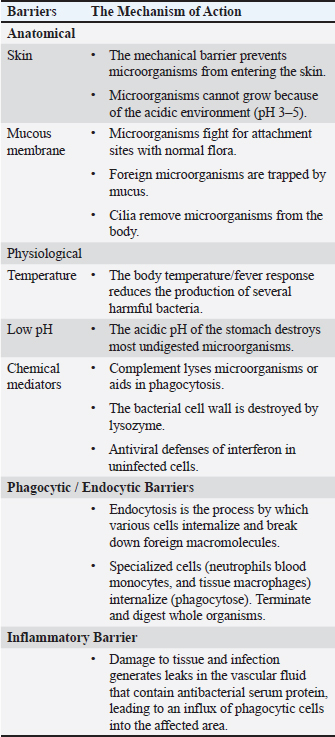 Fig. 1. Primary and Secondary lymphoid organs. Enmeshed in the immune complex, mature B and T cells are transferred from primary or lymphoid tissue for the development stage, termed immune movement or immune peripheralization. Table 1. The nonspecific host defense mechanisms.