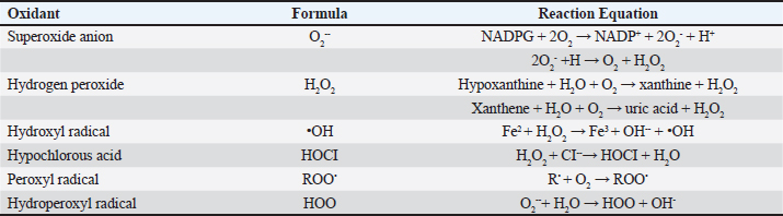 FRs are generated through three distinct mechanisms: (a) via the hemolytic rupture of a normal molecule’s covalent bond, (b) by extracting an electron from an ordinary molecule, and (c) by introducing an electron into a regular molecule (Chen et al., 2021). FRs can target various molecules within the body. The detrimental impacts of ROS/RNS leading to biological harm are termed oxidative stress and nitrosative stress, respectively (Lobo et al., 2010; Phaniendra et al., 2015). FRs can cause cellular damage and disrupt homeostasis by attacking essential macromolecules. Excessive ROS can impair the proper functioning of cellular lipids, proteins, or DNA. Redox homeostasis is maintained through “redox regulation,” establishing a balanced equilibrium between FRs’ beneficial and detrimental effects within a living organism (Birben et al., 2012). Oxidizing agents in poultryAlthough genetics play an important role in poultry production, the environment and nutrition should be optimal for maximum growth and health statuses (Kachungwa Lugata et al., 2022). Stressors are agents capable of producing stress at any time (Rostagno, 2020). Stress initiates the defense system and increases energy and nutritional demands, especially amino acids, trace elements, and vitamins. Oxidative stress results from ROS overproduction or insufficient antioxidant defense systems (Halliwell, B. and Gutteridge, J.M. (2015). Various environmental, nutritional, and biological stressors can impact poultry production, reducing reproductive and growth performances and compromising the general health of the birds (Surai et al., 2019). Many metals, such as calcium, magnesium, potassium, sodium, and iron, are essential animal micronutrients. However, they may be toxic at high concentrations by increasing ROS formation (Koivula and Eeva, 2010). Nonoptimal temperature, lighting (Huth and Archer, 2015), and ventilation impact the overall growth rate and are considered environmental stressors for poultry. Moreover, nutritional stressors of poultry include mycotoxins, oxidized fats, low water quality, and toxic metals such as lead, cadmium, and mercury (Guo et al., 2019). Also, microbial and viral infections and disturbances in gut microbiomes are some of the internal stressors that negatively affect the growth performance of poultry. Endogenous sources of ROSROS are generated through the ordinary metabolic processes of cells, originating from molecular oxygen. ROS can be categorized into two types: FRs and nonradicals. FRs are molecules possessing one or more unpaired electrons that confer reactivity upon the molecule. Nonradical forms emerge when two FRs exchange their unpaired electrons. The superoxide anion (O2•−), hydroxyl radical (•HO), and hydrogen peroxide (H2O2) are the three most physiologically significant ROS (Table 3) (Phaniendra et al., 2015). The superoxide anion is formed by adding a single electron to molecular oxygen (Miller et al., 1990). The fundamental components include nicotinamide adenine dinucleotide phosphate [NAD(P)H) oxidase, xanthine oxidase, and the mitochondrial electron transport system. The mitochondria, responsible for ATP synthesis, act as the primary source of the superoxide anion. Typically, electrons move through the mitochondrial electron transport chain to convert oxygen into water. However, a small fraction, roughly 1%–3%, escapes, generating superoxide. NAD(P)H oxidase is found in polymorphonuclear leukocytes, monocytes, and macrophages. These cells create a surge of superoxide during phagocytosis, contributing to bactericidal action. Superoxide dismutases (SODs) are pivotal in converting superoxide to hydrogen peroxide. The plasma membrane facilitates the easy diffusion of hydrogen peroxide. Table 3. Major endogenous sources of ROS.