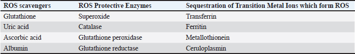 AntioxidantsThe body’s antioxidant systems can tolerate mild oxidative stress in poultry. However, oxidative stress can be reduced by reducing exposure to oxidizing agents, increasing endogenous and exogenous antioxidant levels, and stabilizing mitochondrial energy production efficiency. Enzymatic antioxidantsThe direct enzymatic antioxidant system and the indirect enzymatic antioxidant system serve as crucial defenses against ROS. Enzymatic antioxidants include catalase, SOD, glutathione peroxidase, glutathione reductase, and other relevant enzymes (Ighodaro and Akinloye, 2018). There are two categories of enzyme antioxidants: primary and secondary defenses. Glutathione peroxidase plays a role in reducing peroxides by contributing two electrons, forming selenols, and also neutralizing peroxides. On the other hand, catalase converts hydrogen peroxide into water and molecular oxygen, utilizing them as substrates. Additionally, SOD converts superoxide anions into hydrogen peroxide, which subsequently acts as a substrate for catalase (Rahman, 2007). Nonenzymatic antioxidantsDifferent classes of nonenzymatic antioxidants are present, encompassing vitamins (A, C, E, and K), enzyme cofactors (Q10), minerals (Zn and Se), organosulfur compounds (like allium and allium sulfur), nitrogen compounds (such as uric acid), peptides (like glutathione), and polyphenols (which include flavonoids and phenolic acid)(Mann et al., 2018; Tan et al., 2018). Endogenous antioxidantsEndogenous antioxidants can be categorized into primary antioxidants, which deactivate ROS by converting them into intermediate forms. Primary antioxidant enzymes include SOD, catalase, and glutathione peroxidase. These antioxidants are found in water-soluble forms like ascorbate, glutathione, and uric acid, as well as lipid-soluble forms such as tocopherols, ubiquinols, and carotenoids (Shu, 1998). Secondary antioxidant enzymes directly eliminate ROS. They modulate their functions by reducing peroxide levels and providing a constant supply of NADPH (nicotinamide adenine dinucleotide phosphate) and glutathione to primary antioxidant enzymes. Notable secondary antioxidants comprise glutathione reductase, glucose-6-phosphate dehydrogenase, glutathione-s-transferase, and ubiquinone. Moreover, the activity of antioxidant enzymes is enhanced by the presence of iron, copper, zinc, manganese, and selenium (Gale, 2001; Vertuani et al., 2004). Exogenous antioxidantsExogenous antioxidants are present in various herbs, spices, foods, vitamins, plants, and other sources. These agents with antioxidant properties have gained significant importance in both the clinical and research realms, as they can be utilized to treat various pathological conditions (Lourenço et al., 2019). A multitude of polyphenolic compounds, including flavonoids, isoflavones, flavones, isocatechins, anthocyanins, coumarins, lignans, catechins, and epicatechins, as well as phenolic acids like hydrocinnamic acid, hydrobenzoic acid, gallic acid, ellagic acid, and others, have emerged as crucial phytochemical antioxidants. Clinical and preclinical trials are currently in progress to explore the bioactive characteristics of these compounds (Farag et al., 2020). Table 5. Antioxidant enzymes that scavenge ROS.