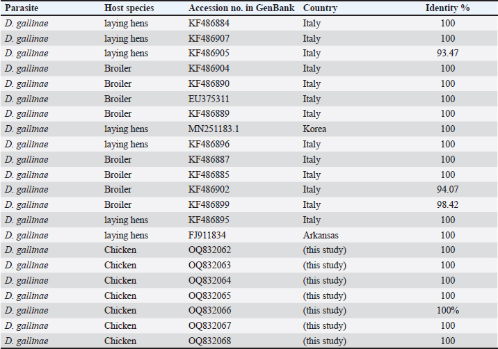 DiscussionDermanyssus gallinae, poses a danger to the global poultry sector. PRM-infested chickens display a number of health issues, such as anemia, hypothenia, and decreased feed conversion, which lowers egg production and causes large financial losses (Fujisawa et al., 2023). Given that Orinthonyssus sylviarum, the northern fowl mite, and D. galline share the same host and habitat, so it is crucial to distinguish the two species based on their morphological characteristics (Di Palma et al., 2012). Consequently, molecular techniques are used for D. gallinae phylogenetic research (Salim et al., 2023). Some of the studies have shown that nucleotide sequences have been employed by numerous laboratories in the US, Europe, Brazil, Australia, and Japan to obtain molecular characteristics of D. gallinae. The mite migrates both within and between the nations, according to molecular epidemiological studies (Chu et al., 2015). The previous study in Al-Baha recorded the lowest infestation rate of 3.13% (Gharsan and Elhassan, 2019). Approximately D. gallinae with total infestation of 29.31% (17.24% in males and 12.07% in females) has been reported in the Hail region of Saudi Arabia (Abdelmageed et al., 2018). The differences in the prevalence may be due to the numerous factors, such as the season of inspection, population density, feeding fluctuations, personal care of birds, climate, and sanitation etc., In spite of the abundance of morphological investigations, genetic data on D. gallinae identification in Saudi Arabia is quite limited. However, our results of infestation rate disagree with the findings of Salim et al. (2023) carried out in Punjab region of Pakistan, where it was found that the infestation peak of D. gallinae was 44%. The rate of infestation of this species seems to differ between the countries. For instance, the infestation rates in Egypt, Algeria, and Tunisia were found to be 2.35% (Hassan et al., 2023), 1.18%, (Nahal et al., 2021), 24.14%, 74% (Gharbi et al., 2013) respectively.