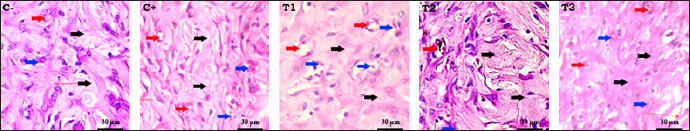 Fig. 1. Histology of (Black arrows) collagen deposition, (Blue arrows) PMN score, and (Red arrows) angiogenesis degree in all treatment groups on day 15 (Hematoxylin and Eosin, 400×).