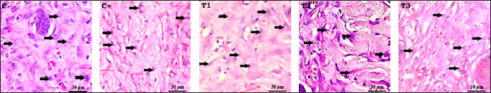 Fig. 2. Histology of (Black arrows) fibrosis degree in all treatment groups on day 15 (Hematoxylin and Eosin, 400×). DiscussionIn this study, the C- group reported the lowest collagen deposition, presence of PMN, angiogenesis, fibrosis degree, and IL-2 level. The C-group of albino rats with incision wounds received no compounds or medications that would have aided in the rats’ wound-healing process, which is how the outcome was reached. The insufficient presence of advantageous substances or medications resulted in extended inflammation, inappropriate wound healing, and sluggish collagen stimulation (El-Hamoly et al., 2019). This study revealed that the wound healing parameters of the C+ group were comparable to the T3 group and lessen than those of other treatment groups. Povidone-iodine was administered to the C+ group, which included antibacterial components, and the outcome was observed. Antibacterial ingredients stop microbial development and contamination by inhibiting protein production, which in turn aids in the healing process of wounds. By reducing excessive inflammation, this medication may also result in an increase in collagen deposition and accelerate the healing of wounds during the inflammatory phase (Cunha et al., 2019). The T1 group showed a significant improvement (p < 0.05) in fibrosis degree, angiogenesis, PMN presence, collagen deposition, and IL-2 compared to the other treatment groups. This study demonstrated that the ideal dosage for Sappan wood extract ointment was 6.5%. These outcomes had to do with the Sappan wood secondary metabolites, which had therapeutic value. Among the secondary metabolites found in plants, especially in Sappan wood, are flavonoids, saponins, tannins, alkaloids, and specific active compounds like brazilin (Vij et al., 2023). The bacterial peptidoglycan membrane becomes more permeable when saponins contact with bacterial cells, causing the bacteria to be lysed (Fikri et al., 2020). Saponins have the potential to enhance monocyte proliferation by increasing the quantity of macrophages and secreting growth factors that aid in the production of fibroblasts and the synthesis of collagen in the wound area (Solikhah et al., 2022). Additionally, saponins could quicken keratinocyte migration, which was crucial to the re-epithelialization process (Shin et al., 2018). Flavonoids possess the capacity to lower free radicals as an antioxidant. Free radicals have the potential to impede wound healing by suppressing collagen tissue contraction, inflammatory responses, and cell proliferation (Engwa, 2018). Several substances found in Sappan wood, such as brazilin, have antibacterial and anti-inflammatory properties. Due to its greater antioxidant efficacy compared to commercial antioxidants like BHT and BHA, betelain found in Sappan wood has greater promise as a free radical counter-agent (Fasihnia et al., 2020). Antioxidants can bind to free radicals and minimize damage to cell membranes during the proliferative phase (Acworth et al., 2017). Because the phenolic compounds in Sappan wood stopped the chain reaction caused by the emergence of free radicals, flavonoids, and brazilin were also able to halt oxidation reactions. As hydrogen donors, phenolic substances can inhibit the production of free radicals (Zeb, 2020). The tannin component in Sappan wood extract may promote wound healing by several cellular processes, including removing reactive oxygen species and free radicals, promoting wound grafting, and stimulating capillary blood vessels and fibroblasts. Tannins served as astringents, preventing minor bleeding and exudate to hasten the healing process (Medel-Marabolí et al., 2017). Fibroblast migration and proliferation in the wound area were influenced by tannins and saponins (Rodrigues et al., 2019). Humidity was another element that could vary and have an impact on the outcomes. Because the moisture was occlusive to water and germs yet permeable to oxygen and water vapor, wound healing proceeded unhindered (Panggabean et al., 2023). One of the most crucial components that affect how cells metabolize energy and heal wounds through oxygenation responses is oxygen (de Smet et al., 2017). Compared to the T2 and T3 groups, the T1 group had a higher moisture content. Elevated oxygen levels in the wound tissue could be caused by sufficiently high moisture levels. Moreover, collagen production may be accelerated and stimulated by the fibroblast proliferation process. Oxygenation and moisture content had an impact on the outcome, as they were two of the key elements affecting the wound healing process (Gupta et al., 2022). Reduced oxygen pressure in wound tissue would be the result of reduced moisture content. Reduced oxygen pressure might impact fibroblast, macrophage, and neutrophil function, leading to a small inhibition of collagen formation (Wlaschek et al., 2019). The three stages of the wound healing process are generally referred to as the inflammatory, proliferation, and remodeling phases. Proliferating macrophages gather in the vicinity of the wound during the inflammatory phase (Hisyam et al., 2023). Conversely, the proliferative phase will be accompanied by the development of collagen, angiogenesis, and epithelialization (Prastika et al., 2020). In the following remodeling phase, fibroblasts, collagen, edema, and new blood vessels will all rapidly form and mature. In order to keep the tissue strong around the wound, collagen is essential (Hamid et al., 2018; Spielman et al., 2023). Put another way, since Sappan woods have antibacterial, anti-inflammatory, and antioxidant properties, giving those rats 6.5% Sappan wood extracts standardized to ointment-based may hasten the healing of the incised wound relative to other treatment groups. The process of wound healing will involve the synergy of these three actions. Thus, our findings supported the following study hypothesis that Sappan wood contains active chemicals that promote wound healing,