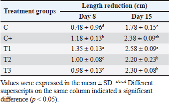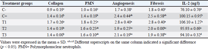 Ethical approvalThe current study was authorized by The Ethical and Health Research Committee, Universitas Airlangga with reference No. 452/HRECC.FODM/VII/2021. This ethical approval was considered to avoid animal abuse during the study. ResultsWound length evaluationThere were no adverse reactions on the animals or the area of the wound during the investigation. At postoperative days 8 and 15, the wound healing process was clinically unremarkable in all groups. The reduction in wound length was reported to be significant in the T1 group compared to the other groups (p < 0.05) on days 8 and 15 (Table 1). Histopathological findingsIn general, the T1 group was found to be significantly different from C-, C+, T2, and T3 groups (p < 0.05) on the wound healing parameters, i.e., collagen, PMN, angiogenesis, and fibrosis degree. This study’s findings also indicated that the treatment groups T1, T2, and T3 reported significant compared to C+ (p < 0.05) (Table 2). In comparison to other groups, the C- group had a lower collagen deposition, closed incision wound region, angiogenesis, and PMN infiltration (Fig. 1). Compared to the T1 and T2 groups, the histological figure of the T3 group indicated less commonly generated collagen tissue and fibrosis degree (Figs. 1 and 2). Briefly, the group treated with 6.5% Sappan wood extract (T1) showed increased collagen synthesis, angiogenesis, and tissue fibrosis, all of which pointed to a favorable healing phase. Evaluation of IL-2 cytokine levelsThe T1, T2, and T3 groups were reported the highest blood serum IL-2 levels on day 15. However, the ointment with 6.5% Sappan wood extract used in T1 was improved significantly for wound healing compared to other groups (p < 0.05) (Table 2). Table 2. Evaluation of the wound healing process on day 15.