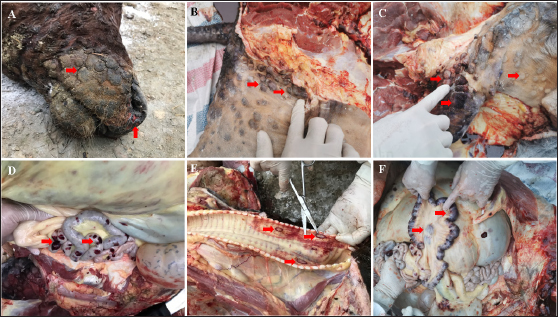 Fig. 1. Clinical signs of lumpy skin disease in cattle in the study area in Ha Tinh province of Vietnam. Nodule lesion in mouth (A), Nodule lesion in back leg (B), Nodule lesion in font leg (C), hemorrhage in small intestine (D), nodule lesion in trachea (E), and hemorrhage in intestinal lymph node (F). To confirm the presence of LSDV in the clinical case, three WOAH-recommended methods for agent detection were performed, including PCR, virus isolation, and transmission electron microscopy. First, DNA extracted from skin nodules was used as a template for the conventional PCR to confirm the presence of the DNA of LSDV, and the results demonstrated that the samples were positive for LSD (Fig. 2A). LSDV from the clinical samples were isolated and propagated in MDBK cells lines. The characteristic CPE in the MDBK cell line is shown in Figure (2B. This effect was marked by cell rounding and clustering, forming rosette-shaped aggregations scattered across the monolayer sheet after 24 hours post-infection (hpi). Over time, these aggregations increased, ultimately resulting in the detachment of the cell monolayer after 96 hpi. By this point, most sheets exhibited vacuoles due to cell detachment, with the remaining cells either aggregated or elongated. Notably, the CPE was observed solely in the infected cells, not the uninfected control cells, as depicted in Figure 2B. This observation confirmed the presence of LSDV in the field sample. Furthermore, electron microscopy imaging revealed a membrane surrounding the capsid structure (Fig. 2C). Viral particles were identified within the MDBK cell cultures. These virions exhibited a large, mature, ovoid shape with rounded ends. Notably, the viral particles presented as ovoid electron-dense bodies, displaying the characteristic short mulberry-like features, as shown in Figure 2C. According to the WOAH, PCR, virus isolation, and electron microscopy methods are recommended for LSDV diagnosis from field samples (WOAH, 2021). These results also confirmed the success of LSDV isolation from the clinical samples. This strain is named as LSDV/Vietnam/HaTinh/CX01. For genetic analysis of the CX01 LSDV strain, PCR sequencing was used to analyze the genetic information of CX01 LSDV compared to the LSDV/Vietnam/Langson/HL01 strain (a well-known reference strain from the first outbreaks in Vietnam). Three primer sets were used to amplify the P32 gene (LSDV074), RP030 (LSDV036) gene, and GPCR (LSDV011) gene, as previously described (Zhu et al., 2013; OIE, 2017; Sameea Yousefi and al., 2017; Alexander et al., 2019; Kononov et al., 2019; Ochwo et al., 2020;). The results indicated that the nucleotide comparison between the LSDV/Vietnam/HaTinh/CX01 virus strain and the LSDV/Vietnam/Langson/HL01 (MW326769), as well as the China strain Xinjiang/2019 (MN598005) and the China/XJ/2019 (MN518933), was 100% identical based on the P32 and RP030 (Table 1, Fig. 3B and C). Additionally, it was 100% and 99.39% identical for the ISI-lumpyvax strain, 100% and 99.31% identical for the Neethling strain, and 100% and 90.01% identical for Saratov/2017, as shown in Table 1. In contrast, using the BLAST tool from NCBI to identify the nucleotide of GPCR of CX01 LSDV strain with other reference virus strains, it was 99.91% identical with the HL01 strain (GenBank accession no. OR137811), 99.65% identical with the Xinjiang/2019 strain, 98.60% identical with two vaccine strains, and 98.87% identical with Saratov/2017 strain (Table 1). A recent study indicated that in the GPCR gene, the nucleotide sequence mutation or amino acid mutation, such as addition or deletion, was found in some LSDV strain field samples. The resulting GPCR gene is suitable for use in the host-range grouping of capripoxviruses and subgrouping of LSDV (Santhamani et al., 2014; El-Tholoth and El-Kenawy, 2016; Cetre-Sossah et al., 2017). Furthermore, the GPCR genes have played an important role in the viral ligand-to-cell receptors, cell activation, replication, virulence, neutralizing antibody response, or responses to antiviral drugs (Le Goff et al., 2009). Research in Russia (2017), based on nucleotide and amino acid sequence of the GPCR gene protein, the Saratov/2017 LSDV strain was identified and classified into a new vaccine-like LSDV strain circulating in Russian cattle (Kononov et al., 2019). The findings suggest that the emergence of new variants within LSDV strains is a significant concern. This is particularly concerning due to the potential for the circulation of both field and vaccine strains, it may be contributed to the development of a new variant of LSDV (Fig. 3A). Interestingly, the LSDV/Vietnam/HaTinh/CX01 strain displays a 12-bp insertion homologous to the vaccine strain. Our findings reveal that the field strains are segregated into new variants based on GPCR analysis. These findings would be helpful to Vietnam in considering any concerns in the development of a vaccine program using the field strain to develop inactivated, live attenuated LSDV or recombinant vaccine programs to control prevalent LSDV in Vietnam.