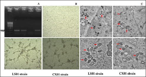 Fig. 2. LSDV Confirmation in clinical case by three WOAH recommended methods (A) Gel photograph of p32 gene PCR (B) LSDV strains LS01 and CX01 with cytopathic effect (CPE) at the second passage on MDBK cell line (below) and uninfected MDBK cell line after 96 hpi and (C) Transmission electron micrograph showing large LSDV particles in the MDBK of infected cells as a brick shape with rounded ends and characteristic short surface tubules (mulberry) with Scale bar: 500 nm and 1μm. Table 1. The nucleotide identity of LSDV/Vietnam/HaTinh/CX01 strain in north-central Vietnam in comparison with LSDV/Vietnam/Langson/HL01 isolated in the first outbreaks in Vietnam and other reference sequences was performed using the Blast tool at the NCBI database and using the information of published sequence.