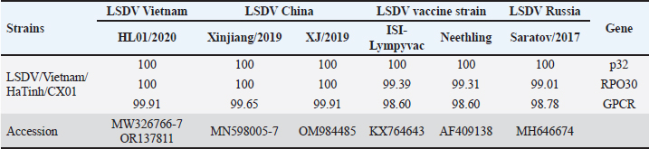 AbstractBackground: In 2021, Vietnam experienced an outbreak of Lumpy skin disease (LSD), which infected 207,687 cattle and buffaloes, as officially reported, and resulted in the culling of 29,182 animals. Aim: In this study, samples from cattle that died and showed typical signs of LSD in the Ha Tinh province of Vietnam were confirmed by three World Organization for Animal Health (WOAH)-recommended methods and further studied to compare the Vietnam and China reference strains to the new clinical cases. Methods: Three methods recommended by WOAH for agent detection (PCR, virus isolation, and transmission electron microscopy) were used to confirm this clinical LSD case. The sequence analysis of three well-known markers (P32, RPO30, and GPCR genes) has been utilized in Vietnam to understand this circulating pathogen better. Results: Our findings showed that the CX01 LSDV strain is 100% identical to the Vietnam reference strain HL01 and China reference strains based on P32 and RPO30 genes. Interestingly, analysis of the nucleotide sequence of the GPCR gene showed that the CX01 strain belongs to the same cluster as the reference strains, but it has branches different from those of both the HL01 and China LSDV strains. The nucleotide identification between the CX01 strain and these reference virus strains ranked 99.65%–99.91%, suggesting that it is a new variant of LSDV. Conclusion: This finding is new and indicates that at least two variants of the LSD virus were circulating in Vietnam based on analysis of the GPCR gene. Additionally, these results suggest that the sequence analysis of the GPCR gene is a great tool for subgrouping LSDV circulating in Vietnam. Keywords: Lumpy skin disease, MDBK, Diagnosis, GPCR, Vaccine. BackgroundLumpy skin disease (LSD) represents a resurging viral affliction affecting cattle and buffaloes, resulting in significant economic loss, and its severity prompted the World Organization for Animal Health (WOAH) to classify LSD as a notifiable disease (WOAH, 2021). Transmitted by blood-feeding vectors like mosquitoes and flies, the LSD virus (LSDV) exploits favorable climates to propagate swiftly (Sanz-Bernardo et al., 2021). The LSD epidemic in Europe and Asia has left a profound mark, impacting thousands of livestock and causing substantial financial setbacks. These include losses incurred from animal deaths, diminished productivity, expenses associated with containment efforts, and the forfeiture of export opportunities (Casal et al., 2018). Clinical manifestations of LSD range from subclinical to fatal, contingent upon strain virulence and the susceptibility of cattle breeds. Generally, mortality rates hover below 10%, while morbidity rates can soar up to 90% (OIE, 2017; Sprygin et al., 2018a; WOAH, 2021). Historically confined to southern and eastern Africa since its detection in Zambia in 1929, LSD saw its first outbreak beyond the continent in Egypt and Israel between 1988 and 1989 (Beard, 2016). Today, it maintains an endemic presence in most African nations and has traversed southeastern Europe, the Middle East, and South Asia (Acharya and Subedi, 2020). Recent outbreaks have also been reported in China, India, Bangladesh, and Nepal (Acharya and Subedi, 2020; Lu et al., 2020; Sudhakar et al., 2020; Hasib et al., 2021). The LSD outbreak was first reported in Vietnam in October 2020 (Tran et al., 2020). In addition, over 200,000 cattle and buffaloes were infected, and approximately 30,000 animals were culled during the new Vietnamese outbreak in 2021. These losses were significantly reduced in 2022, as only 2,274 cattle and buffaloes were infected (455 animals culled), indicating success in LSD vaccine strategies (DAH, 2023). The vaccination with the live-attenuated LSDV vaccines was used for the Neethling virus strain, and the goat pox vaccine has been used as a key to the control of the disease in Vietnam. Currently, the Vietnamese Government has approved three live-attenuated LSDV vaccines (ISI-Lympyvac and 2 vaccines using Neethling strain) and one goat pox vaccine, and these vaccines play an important role in the national vaccine program to control and prevent this disease in Vietnam. The homologous of vaccine strains and LSD field strains in Vietnam was more than 99% with the GPCR gene and 100% with the p32 gene. Bioinformatics and phylogenetic tree analysis of LSDV strain using WGS or partial genomes such as GPCR, P32, RPO30, ORF103, or TK genes of LSDV have classified the LSDV into two subgroups (Biswas et al., 2020; Kononov et al., 2019; Ma et al., 2022; Santhamani et al., 2014). The current pool of available nucleotide sequences divides the LSDV into three major phylogenetically distinct lineages: clade 1.1, clade 1.2, and clade 2.5. Clade 1.1 includes classical Neethling-type field strains and is restricted to Africa. Clade 1.2 includes Kenyan/KSGP type field strains that are predominantly present in Africa, the Middle East, Eurasia, and Indian subcontinents (India, Pakistan, Nepal, Srilanka, Bangladesh, Bhutan). The majority of the recombinant LSDV strains are grouped under clade 2.5, which are predominantly circulating in Southeast Asia, including Russia, China, Vietnam, Thailand, and Taiwan (Agianniotaki et al., 2017; Flannery et al., 2022; Ma et al., 2022; Mathijs et al., 2020; Mathijs et al., 2021). The minor populations of clades 2.1, 2.2, 2.3, and 2.4 is present in Russia and Kazakhstan. Previously, it was assumed that these recombinant strains emerged naturally in the field (Kononov et al., 2019). However, later it was confirmed that this was the result of the vaccine spillover and generated due to mishandling of the multiple LSDV strains in the cell culture in the laboratory in Kazakhstan (Vandenbussche et al., 2022), and later, via the vaccine injected into the animals in Kazakhstan. From Kazakhstan, these recombinant vaccine-like strains spread to Russia and China. Nevertheless, natural recombination events in capripoxviruses have never