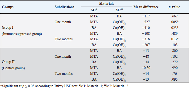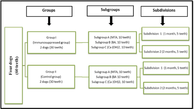 ABSTRACTBackground: Azathioprine is one of the earliest immunosuppressants prescribed for several autoimmune diseases. Yet there is a lack of research on the impact of azathioprine on pulp healing following the pulp capping procedure. Aim: This study aimed to investigate the effect of azathioprine on the healing ability of mechanically exposed dogs’ dental pulps following direct pulp capping with mineral trioxide aggregate (MTA), bio-aggregates (BA), and Calcium hydroxide (Ca(OH)2). Methods: Four mongrel dogs were randomly assigned to two groups (two dogs/30 teeth in each group): immunosuppressed (group I) and control (group II). Group I received azathioprine for two months before surgical treatments and until the dogs were euthanized. Fifteen class V buccal cavities were performed in each dog. Each group was randomly divided into three subgroups (10 teeth each) based on the pulp capping substance. The pulps in subgroups A, B, and C were immediately capped with MTA, BA, and Ca(OH)2, respectively. Inflammation and dentine bridge development were histopathologically evaluated and scored at one and two months. The data were statistically analyzed. Results: The immunosuppressed group exhibited statistically greater inflammatory cell count and decreased dentine bridge thickness, compared to the control group in all subgroups (p < 0.05). Conclusion: Azathioprine has an adverse effect on the healing of exposed dogs’ dental pulp following direct pulp capping with MTA, BA, and Ca(OH)2. Therefore, patients using azathioprine as an immunosuppressive medication may experience delayed healing of mechanically exposed pulps following capping with MTA, BA, or Ca(OH)2. Keywords: Bio-Aggregates, Calcium hydroxide, Dentine bridge, Immunosuppression, Mineral trioxide aggregate. IntroductionSeveral immunosuppressive medications are administered for several medical conditions, including, but not limited to, autoimmune diseases and organ transplantation. However, the effect of immune suppression is not restricted to a single organ or tissue but rather affects the entire body, including the tooth pulp (Evans, 2004). Up to 40% of immunosuppressed patients experience ulcerative, hemorrhagic, or infectious oral issues as a result of direct or indirect stomatotoxicity (Patel et al., 2006). Furthermore, immunosuppressants have been associated with abnormal secondary dentine growth, pulpal lesions, pulp chamber constriction, increased periapical bone deterioration, and delayed pulpal tissue regeneration (Näsström et al., 1985; Elion, 1993; Oh et al., 2008; Mahmoud et al., 2010; Soliman et al., 2022). Azathioprine is one of the first drugs to be used in immunosuppressive therapy. It is frequently recommended for rheumatoid arthritis, pemphigus, systemic lupus erythematosus, Behçet’s illness, autoimmune hepatitis, atopic dermatitis, myasthenia gravis, neuromyelitis optica (Devic’s disease), restrictive lung disease, post-transplantation, and leukemia (Ayanoglou et al., 1997; Cara et al., 2004; Evans, 2004). Azathioprine has several serious side effects, including bone marrow suppression (leukopenia, thrombocytopenia, and anemia), an increased risk of infection, and excessive bleeding. Long-term azathioprine treatment may potentially cause the formation of malignant lesions (Lopes et al., 1997). Calcium hydroxide (Ca(OH)2) is still widely used for direct and indirect pulp capping. However, it has substantial disadvantages, including its degradation over time, the formation of tunnel flaws in freshly created dentine bridges, and inadequate sealing characteristics (El Ashry et al., 2013). As a result, additional pulp capping materials, such as calcium silicate-based compounds and bio-ceramic aggregates, entered the market and outperformed calcium hydroxide (Al Ashry et al., 2016; Negm et al., 2016; Abo El-Mal et al., 2019, 2021; Kunert and Lukomska-Szymanska, 2020; Al-Sherbiny et al., 2021; Mohamed et al., 2022; Elkhashab et al., 2023, 2024; Mohamed et al., 2023). The current study examined the effect of azathioprine on pulpal tissue healing following direct pulp capping in mechanically exposed dog teeth utilizing mineral trioxide aggregates (MTAs), bio-aggregates (BA), and calcium hydroxide (Ca(OH)2). We expected that azathioprine may delay pulp healing following pulp capping as regards dentin bridge formation and pulp tissue inflammation. Materials and MethodsAnimalsThe sample size was determined based on earlier studies (Mahmoud et al., 2010; Soliman et al., 2022; Seif et al., 2023) using the G*power software 3.1.9.2, where a large effect size of 1.38 was detected. The significance level (α-error) was set at 0.05 and the power (1-β error) was set at 0.8 using a two-sided hypothesis test. The estimated sample size was 30 teeth for each group, summing up a total sample size of 60 teeth at both evaluation periods. The current investigation was conducted on four healthy mongrel male dogs, aging 1.5–2 years and weighed 19–22 kg. Dogs were housed in separate kennels (1.5, 2.5, and 3 m) in a clean environment with a 12-hours light/dark cycle. Dogs were acclimatized to their housing environment and diet for 14 days before conducting the experiment. Dogs were fed twice daily, with soft food and milk. Water was available at all times. In each dog, fifteen maxillary and mandibular teeth, including incisors, canines, and premolars were used. These dogs were randomly divided into two groups (two dogs, 30 teeth each): group I, immunosuppressed animals, and group II, the control. According to the pulp capping material, each group was randomly divided into three subgroups (ten teeth each). MTA (MTA Proroot®-Dentsply, USA), BA (BioAggregate®-Innovative BioCeramix Inc. Vancouver, Canada), and Ca (OH)2 (Dycal®-Dentsply, USA) were employed for direct pulp capping in subgroups A, B, and C, respectively. Each subgroup was further subdivided into two subdivisions (five teeth each) based on the assessment time: subdivision