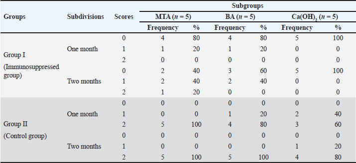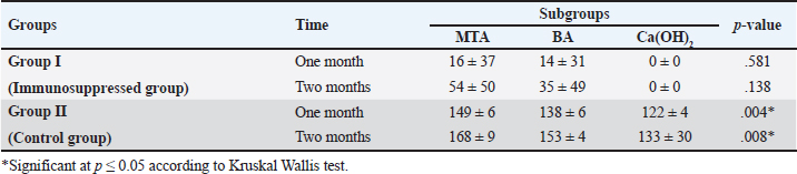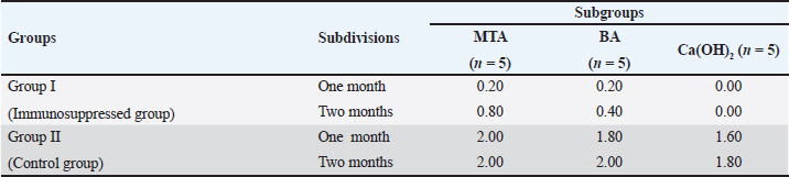 In group II, all subgroups showed a decrease in the mean inflammatory cell count by time. The decrease in the mean inflammatory cell count was statistically significant in both tested groups after two months (p < 0.05) as shown in Table 2. Regarding the effect of different capping materials on inflammatory response in the two tested periods, there was no statistically significant difference between all subgroups in both subdivisions (p > 0.05) as shown in Table 3. Results of dentine bridge formationThere were significant differences in the mean dentine bridge thicknesses between group I (immunosuppressed group) and group II (control group) in both subdivisions (p < 0.05(.The mean scores of dentine bridge formation are presented in Table 4. The frequencies and percentages of dentine bridge formation are shown in Table 5. The mean dentine thickness in micrometers is presented in Table 6. Group I (immunosuppressed group)In subdivision 1 (after one month), the mean dentine bridge thickness (µm) was 16 ± 37, 14 ± 31, and 0.0 in subgroups A, B, and C, respectively. While it was 54 ± 50, 35 ± 49, and 0.0 in subgroups A, B, and C, respectively in subdivision 2 (after two months). No significant differences were observed between the subgroups after one and two months (p > 0.05(. Group II (control group)The mean dentine bridge thickness (µm) was149 ± 6, 138 ± 6, and 122 ± 4 in subgroups A, B, and C, respectively in subdivision 1 and 168 ± 9, 153 ± 4, and 133 ± 30, respectively in subdivision 2. There were significant differences in dentine bridge thickness between the three subgroups after one and two months (p < 0.05). There were significant differences between the two subdivisions in subgroups A and B (p < 0.05). Subdivision 2 had a higher dentine bridge thickness than subdivision 1. DiscussionThe current study investigated the effect of azathioprine as an immunosuppressive drug on dental pulp healing after pulp capping using three commonly used materials. The study’s hypothesis was accepted since our results revealed that azathioprine inhibited the healing of exposed dogs’ dental pulp following direct pulp capping with MTA, BA, and Ca(OH)2. Table 4. Mean scores of dentine bridge formation among the different groups, subgroups and subdivisions.