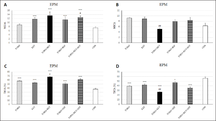Fig. 3. Effects of experimental toxoplasmosis (TOXO), ketamine-induced schizophrenia (KET), simultaneous toxoplasmosis + Ketamine-induced schizophrenia (TOXO + KET), and sulfadiazine-trimethoprim as the treatment for toxoplasmosis (TOXO+SDT) and toxoplasmosis + ketamine-induced schizophrenia (TOXO+SDT+KET) on the number of entries in open arm (NEOA) (A), entries in closed arms (NECA) (B), time spent in open arms (TSOA%) (C), and time spent in closed arms (TSCA%) (D) relative to the control (CON) in the EPM. Values are presented as mean ± SEM for the number of 10 mice per group. *p < 0.05 versus CON, ***p < 0.001 versus CON, #p < 0.05 versus TOXO, ##p < 0.01 versus TOXO (ANOVA followed by Student–Neuman–Keuls test). In the study by Gatkowska et al. (2012), T. gondii infection was found to curtail exploratory activity in mice, dampening their climbing and rearing tendencies during the OFT. Infected mice exhibited a diminished preference for the central zone, displaying increased time spent in the border areas of the OFT. Additionally, grooming behavior was reduced compared to uninfected counterparts (Gatkowska et al., 2012). In our investigation, the induction of toxoplasmosis did not impact total crossings, yet a significant elevation in center crossings and time spent in the central zone of the OFT was observed in TOXO mice. However, grooming, immobility, and rearing behaviors remained unaffected by toxoplasmosis. Conversely, the administration of ketamine resulted in heightened exploratory activity, evidenced by increased total crossings, center crossings, and time spent in the central area among KET mice. This aligns with previous studies highlighting ketamine-induced hyperlocomotion (Onaolapo et al., 2017; Kokkinou et al., 2021; Moghaddam et al., 2021). When schizophrenia and toxoplasmosis were simultaneously induced in TOXO+KET and TOXO+KET+SDT mice, a notable increase in total, border, and center crossings was observed within these groups. The neurotropic protozoan parasite, T. gondii, has been shown to induce specific behavioral shifts in rodents, including a reduction in predator aversion and a decrease in general anxiety (Boillat et al., 2020). Notably, however, a study by Evans et al. did not yield significant findings regarding T. gondii’s impact on anxiety-related parameters in rats subjected to the EPM test (Evans et al., 2014). In our investigation, although TOXO mice did not exhibit a heightened number of entries into open or closed arms compared to CON mice, they displayed an elevated percentage of time in open arms and a reduced percentage of time in closed arms relative to CON mice. These findings suggest that TOXO reduces anxiety and fear behavior in infected mice. In contrast, KET mice exhibited a greater number of entries into open arms and a higher percentage of time spent in open arms compared to CON mice. This phenomenon aligns with the emerging evidence highlighting the pivotal role of glutamatergic neurotransmission in the underlying biological mechanisms of stress responses and anxiety-related disorders (Bermudo-Soriano et al., 2012). Consequently, drugs targeting glutamatergic neurotransmission, including NMDAR antagonists, show promise as future candidates for pharmacological interventions in anxiety-related behaviors. In our study, the simultaneous induction of schizophrenia and toxoplasmosis in TOXO+KET mice remarkably exhibited anxiolytic-like effects in the behavioral tests. The glutamatergic system’s involvement in fear-conditioning acquisition and extinction is well documented (Walker and Davis, 2002). Furthermore, it has been reported that T. gondii-infected mice struggle with consolidating fear, which resonates with our findings of lower anxiety-related behaviors in TOXO+KET and TOXO+KET+SDT mice. This suggests that ketamine might potentiate the neurological impact of T. gondii on anxiety, and the sulfadiazine-trimethoprim treatment for toxoplasmosis did not effectively counter these effects (Ihara et al., 2016). The same has been observed in our study, in mice of TOXO+KET and TOXO+KET+SDT which showed lower anxiety-related behaviors. Probably, ketamine exacerbates neurological effects of T. gondii on anxiety, and treatment of toxoplasmosis by sulfadiazine-trimethoprim was not able to hamper its effects.