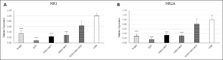 Fig. 6. Effects of experimental toxoplasmosis (TOXO), ketamine-induced schizophrenia (KET), simultaneous toxoplasmosis + Ketamine-induced schizophrenia (TOXO + KET), and sulfadiazine-trimethoprim as the treatment for toxoplasmosis (TOXO+SDT) and toxoplasmosis + ketamine-induced schizophrenia (TOXO+SDT+KET) on the brain mRNA expression of N-methyl-D-aspartate-NR1 (A) and NR2A (B) relative to the control (CON). Values are presented as mean ± SEM for the number of 5 mice per group. ***p < 0.001 versus CON (ANOVA followed by Tukey’s test). ConclusionIn summary, our study demonstrates significant behavioral changes, including hyperlocomotion, anxiety-related behaviors, and memory deficits, induced by both T. gondii infection and ketamine administration in mice. Additionally, a marked decrease in antioxidant enzyme levels and increased lipid peroxidation were observed in the brain samples of mice experiencing toxoplasmosis and schizophrenia-like symptoms. The downregulation of NMDAR subunits, specifically NR-1 and NR2A, likely contributes to the neurological effects observed with T. gondii and ketamine. Treatment with sulfadiazine-trimethoprim showed a mitigating effect on these changes. AcknowledgmentAuthors would like to express their gratitude toward Samad Nouri for his technical support during this study. Authors’ contributionMRY and SH.SH designed the study and wrote the manuscript. SMM contributed to the interpretation and editing of the manuscript. MRY and SH.SH were responsible for data collection and manuscript submission. All authors reviewed the article and approved the final version of the manuscript. FundingThe study was funded by the Islamic Azad University, Karaj Branch. The funder has no role in the design of the study and collection, analysis, and interpretation of data and in writing the manuscript. Conflict of interestThe authors declare that they have no conflict of interest. Data availabilityAccess to all relevant data is free upon request directed to the corresponding author. ReferencesAfonso, C., Paixao, V.B. and Costa, R.M. 2012. Chronic toxoplasma infection modifies the structure and the risk of host behavior. PLoS One 7(3), e32489. Alsaady, I., Tedford, E., Alsaad, M., Bristow, G., Kohli, S., Murray, M., Reeves, M., Vijayabaskar, M., Clapcote, S.J. and Wastling, J. 2019. Downregulation of the central noradrenergic system by Toxoplasma gondii infection. Infect. Immun. 87(2), e00789–e00718. Bermudo-Soriano, C.R., Perez-Rodriguez, M.M., Vaquero-Lorenzo, C. and Baca-Garcia, E. 2012. New perspectives in glutamate and anxiety. Pharmacol. Biochem. Behav. 100(4), 752–774. Boillat, M., Hammoudi, P.-M., Dogga, S.K., Pages, S., Goubran, M., Rodriguez, I. and Soldati-Favre, D. 2020. Neuroinflammation-associated aspecific manipulation of mouse predator fear by Toxoplasma gondii. Cell Rep. 30(2), 320–334. Bottari, N.B., Baldissera, M.D., Tonin, A.A., Rech, V.C., Alves, C.B., D’Avila, F., Thome, G.R., Guarda, N.S., Moresco, R.N. and Camillo, G. 2016. Synergistic effects of resveratrol (free and inclusion complex) and sulfamethoxazole-trimetropim treatment on pathology, oxidant/antioxidant status and behavior of mice infected with Toxoplasma gondii. Microb. Pathog. 95, 166–174. Coyle, J.T. 2012. NMDA receptor and schizophrenia: a brief history. Schizophrenia Bull. 38(5), 920–926. Elmore, S.A., Jones, J.L., Conrad, P.A., Patton, S., Lindsay, D.S. and Dubey, J. 2010. Toxoplasma gondii: epidemiology, feline clinical aspects, and prevention. Trends Parasitol. 26(4), 190–196. Elsheikha, H.M., Büsselberg, D. and Zhu, X.-Q. 2016. The known and missing links between Toxoplasma gondii and schizophrenia. Metabol. Brain Dis. 31, 749–759. Evans, A.K., Strassmann, P.S., Lee, I.-P. and Sapolsky, R.M. 2014. Patterns of Toxoplasma gondii cyst distribution in the forebrain associate with individual variation in predator odor avoidance and anxiety-related behavior in male Long–Evans rats. Brain Behav. Immun. 37, 122–133. Fuglewicz, A.J., Piotrowski, P. and Stodolak, A. 2017. Relationship between toxoplasmosis and schizophrenia: a review. Adv. Clin. Exp. Med. 26(6), 1031–1036. Gatkowska, J., Wieczorek, M., Dziadek, B., Dzitko, K. and Dlugonska, H. 2012. Behavioral changes in mice caused by Toxoplasma gondii invasion of brain. Parasitol. Res. 111, 53–58. Hajizadeh Moghaddam, A., Mashayekhpour, M.A. and Tabari, M.A. 2023. Anxiolytic-like effects of citral in the mouse elevated plus maze: involvement of GABAergic and serotonergic transmissions. Naunyn-Schmiedeberg’s Arch. Pharmacol. 396(2), 301–309. Ihara, F., Nishimura, M., Muroi, Y., Mahmoud, M.E., Yokoyama, N., Nagamune, K. and Nishikawa, Y. 2016. Toxoplasma gondii infection in mice impairs long-term fear memory consolidation through dysfunction of the cortex and amygdala. Infect. Immun. 84(10), 2861–2870. Kantrowitz, J.T. and Javitt, D.C. 2010. N-methyl-d-aspartate (NMDA) receptor dysfunction or dysregulation: the final common pathway on the road to schizophrenia? Brain Res. Bull. 83(3–4), 108–121. Kokkinou, M., Irvine, E.E., Bonsall, D.R., Natesan, S., Wells, L.A., Smith, M., Glegola, J., Paul, E.J., Tossell, K. and Veronese, M. 2021. Reproducing the dopamine pathophysiology of schizophrenia and approaches to ameliorate it: a translational imaging study with ketamine. Mol. Psychiat. 26(6), 2562–2576. Li, Y., Viscidi, R.P., Kannan, G., McFarland, R., Pletnikov, M.V., Severance, E.G., Yolken, R.H. and Xiao, J. 2018. Chronic Toxoplasma gondii infection induces anti-N-methyl-d-aspartate receptor autoantibodies and associated behavioral changes and neuropathology. Infect. Immun. 86(10), e00398–e00318. Lucchese, G. 2017. From toxoplasmosis to schizophrenia via NMDA dysfunction: peptide overlap between Toxoplasma gondii and N-methyl-d-aspartate receptors as a potential mechanistic link. Front. Psychiat. 8, 37. Martynowicz, J., Doggett, J.S. and Sullivan Jr, W.J. 2020. Efficacy of guanabenz combination therapy agai