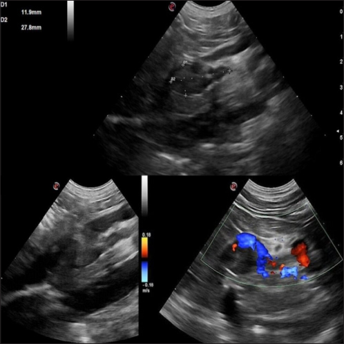 Fig. 2. Right adrenal gland showed an irregular profile and dishomogeneity and the CVC was invaded by a mass not completely occluding the vassel. A residual flow is visible with color Doppler through the vessel. An adrenal neoplasm with invasion of the CVC was suspected and it was decided to perform a total body contrast-enhanced CT investigation to better investigate the adrenal mass and the caval involvement, to evaluate other possible metastases. CT confirmed the presence of a mass at the adrenal level and a structure compatible with a neoplastic thrombus in the CVC (Fig. 3). In the meantime, the patient was hospitalized and treated with: nitroglycerin patch (10 mg/sid), labetalol (0.25 mg/kg/ev, then 25 µg/kg/minute/CRI), furosemide (0.5 mg/kg/hour/CRI), prazosin (1 mg/os), and benazepril (0,5 mg/kg/os/bid), with the aim to reduce the systemic pressure. The patient initially responded to pharmacological therapy, its general conditions improved in 3 days, and, on the owner’s request, the dog was discharged pending adrenalectomy surgery decisions. At discharging, the dog was able to walk without falling, conscious, and reactive to stimulus. Unfortunately, after a few days at home, the clinical signs deteriorated, and in sight of the patient’s general conditions, the owners elected humane euthanasia. A necropsy was performed. In the abdominal cavity, the mass of the right adrenal gland invading the CVC was visualized (Fig. 4). It appeared like a clear, yellowish-looking neoformation. The vessel was grossly distended but it was not completely obstructed. A single specimen including the adrenal mass and the invaded CVC was submitted for histologic examination. Histological diagnosis confirmed the presence of right adrenal PCC with neoplastic invasion of the CVC. A non-capsulated, not-circumscribed neoplasm that completely replaced the right adrenal medulla, compressing, and also infiltrating the adrenal cortex was described. The neoplasm was characterized by polygonal cells arranged in compact, lobules, that often were in a palisade pattern. Neoplastic cells had eosinophilic to brownish granular cytoplasm, irregularly round nuclei with finely punctuated chromatin, and distinct nucleolus. Occasionally, the neoplastic cells arranged in a palisade pattern around the blood vessels, forming sort of rosettes and they presented multifocal areas of necrosis with diffuse hemorrhagic extravasation, fibrin deposition, and rare macrophages. The specimen had moderate anisokaryosis and mild anisocytosis.